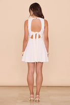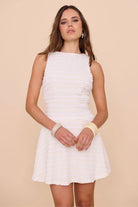 The Linea mini dress features a textured stretchy fabric with a chic open back and a dropped waist for a flattering silhouette. The boat neck, elasticated back waist, and back tie, combined with a clasp fastening and zipper closure, ensure a secure fit and elegant style.