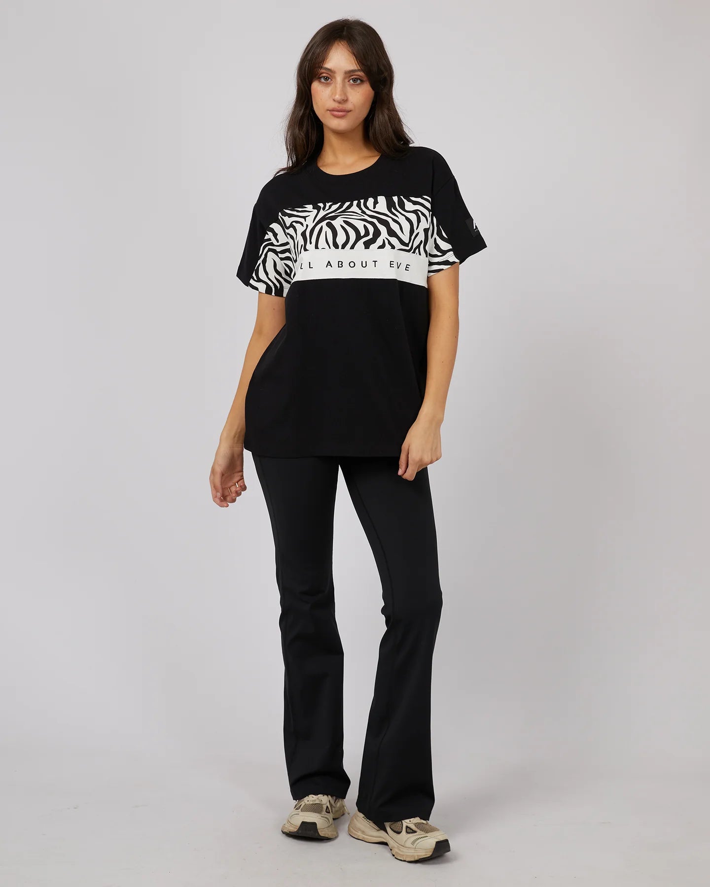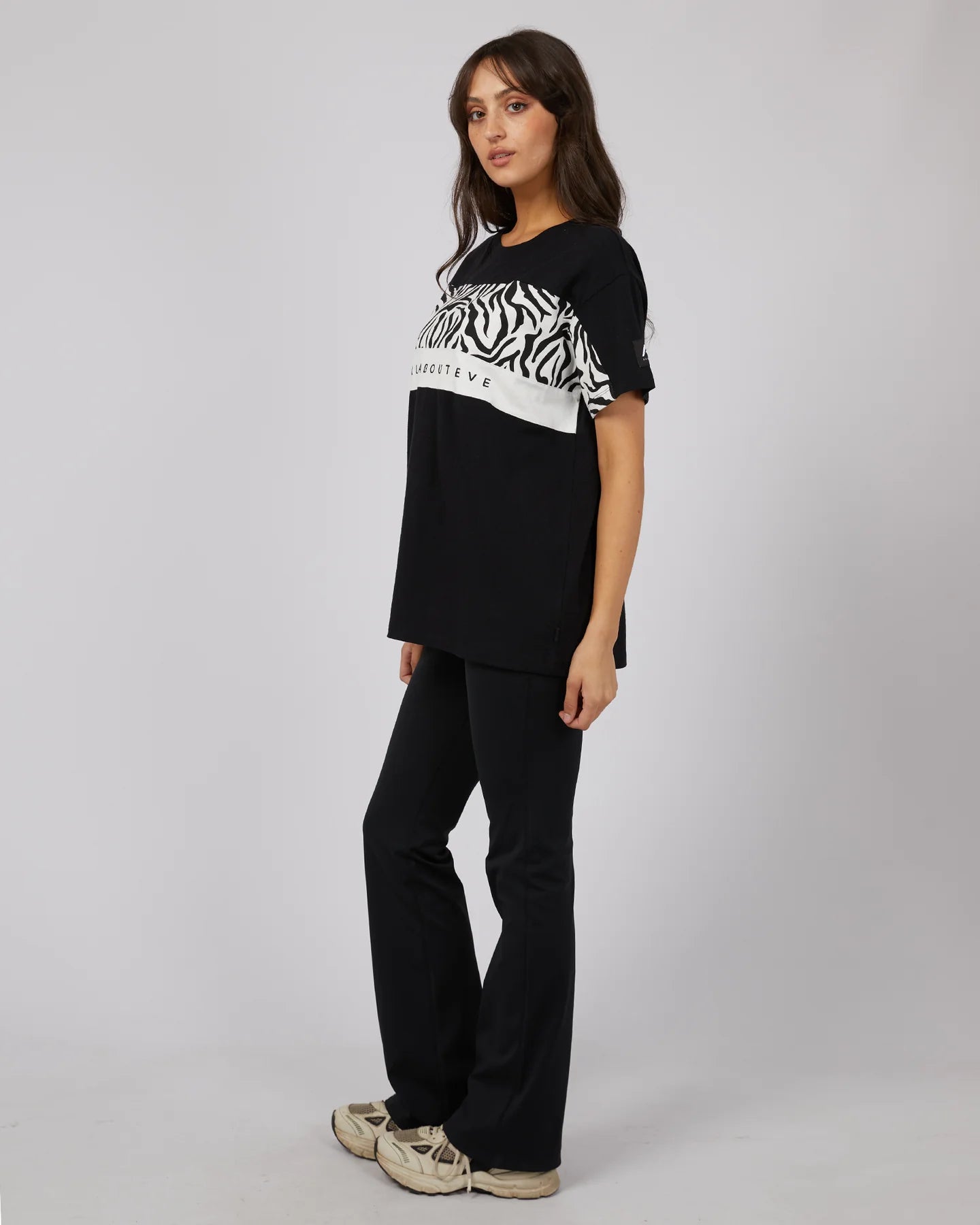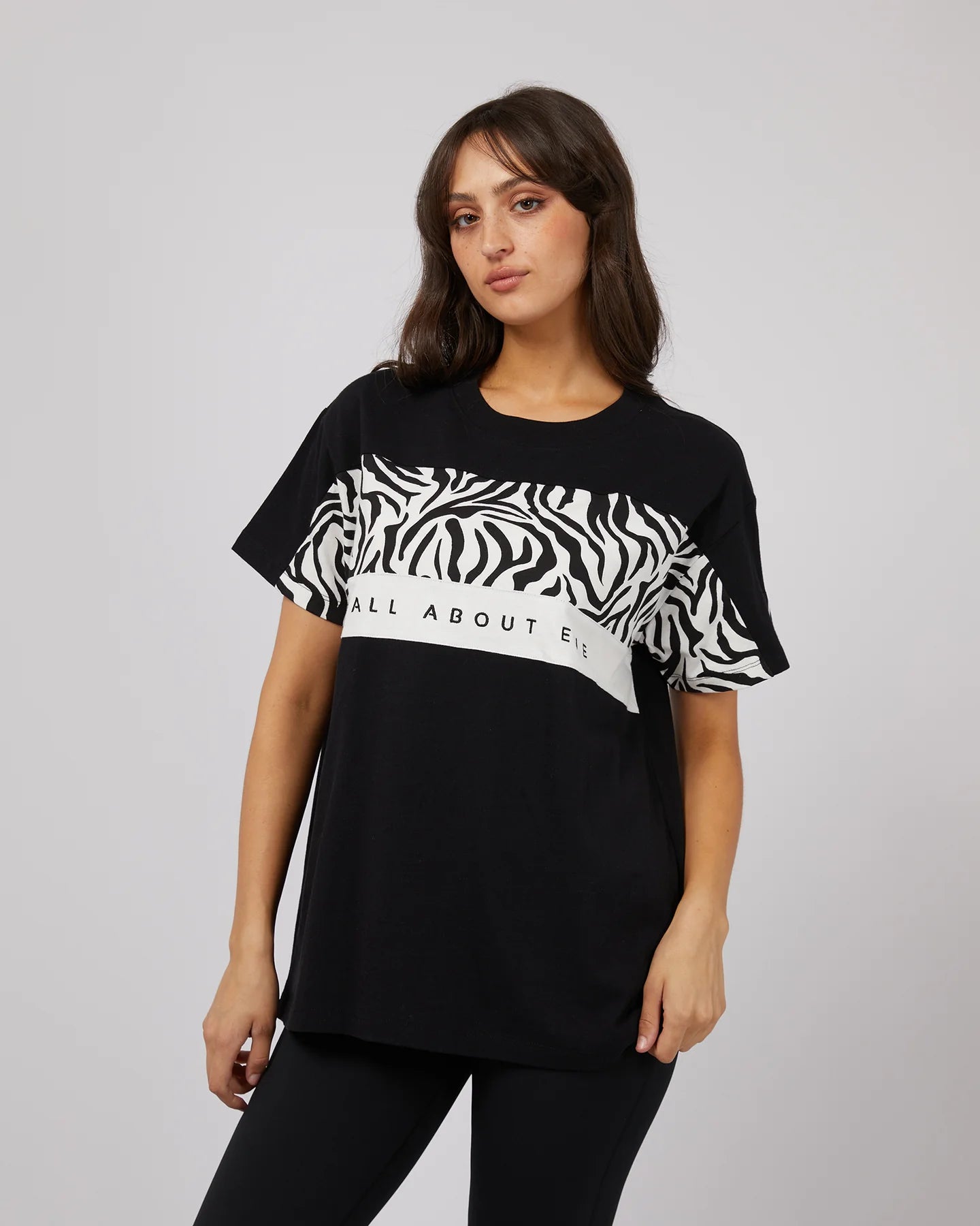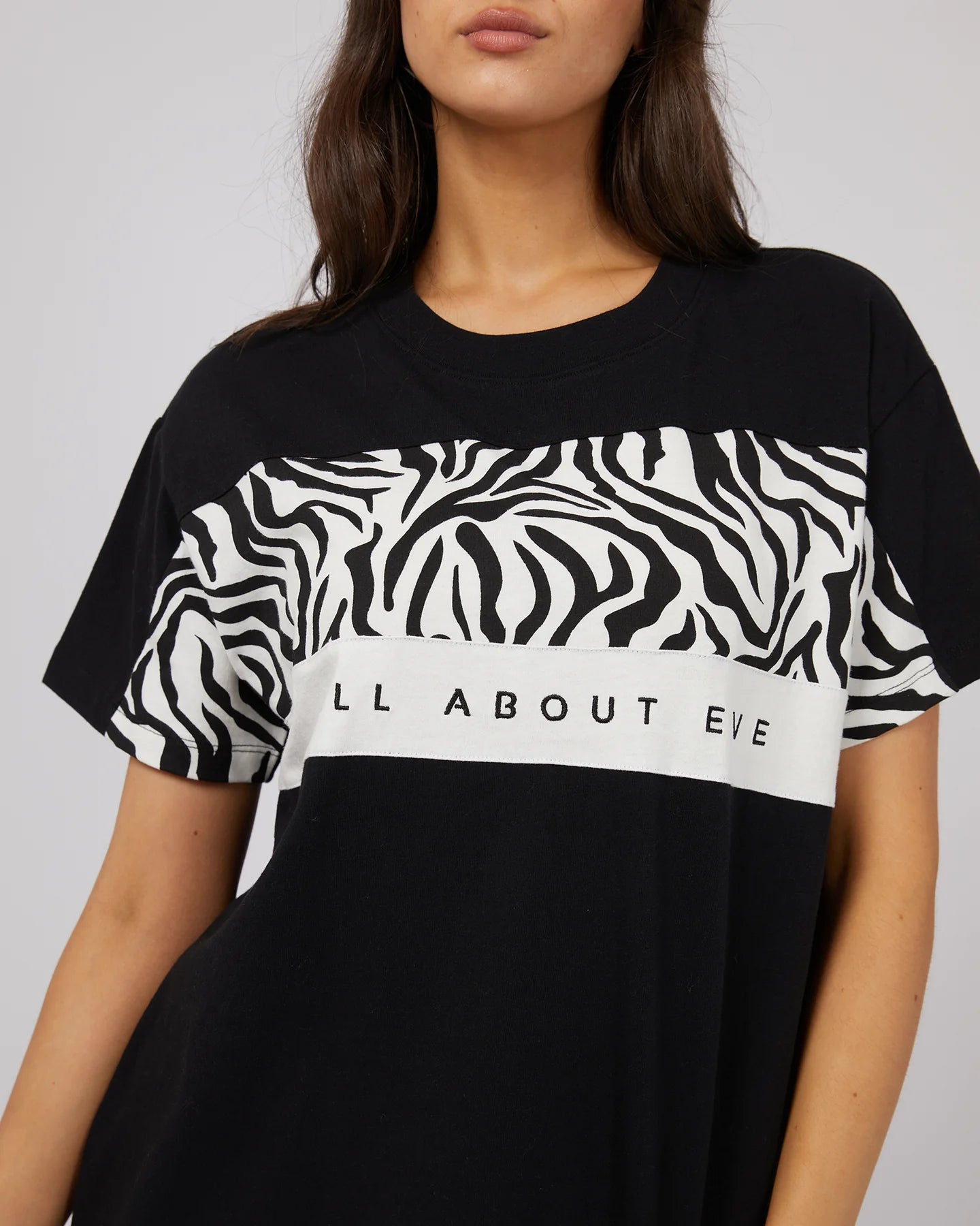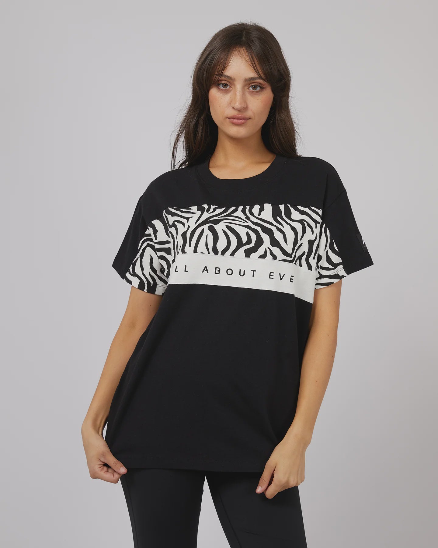 The Parker Panelled Tee is light and comfortable made from soft 100% cotton. Featuring two panels across the front chest, One with the All About Eve exclusive zebra print. Featuring a ribbed neckline with AAE embroidery and badge detailing. The oversized fit looks amazing with the AAE flares, shorts or the jeans and some sneakers for a casual day look.