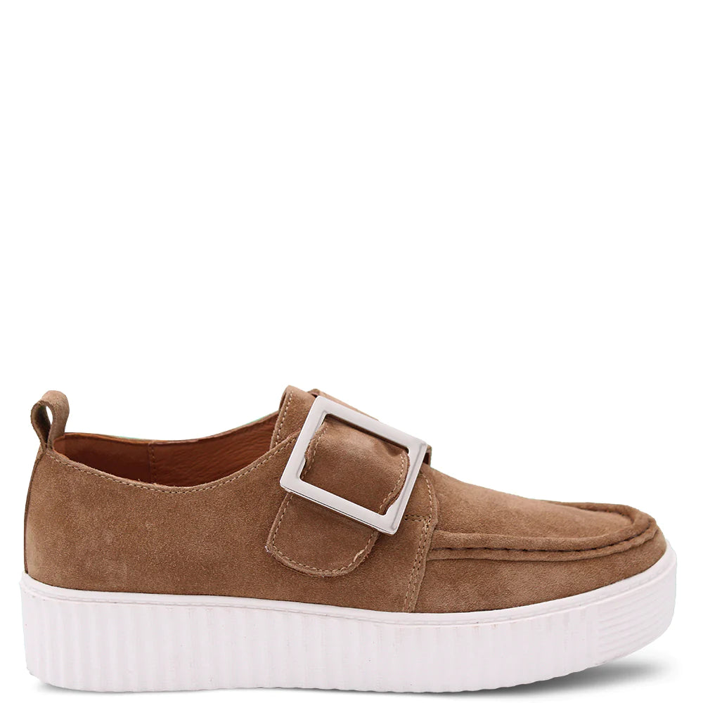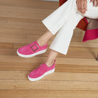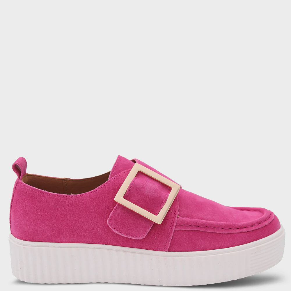 Combining a hot pink suede upper with a striking rectangular feature buckle and velcro strap. Featuring a comfortable white rubber sole and removable arch support leather sock.