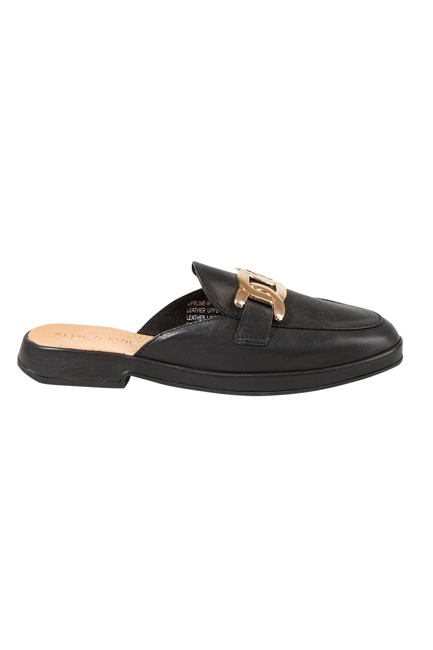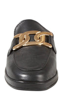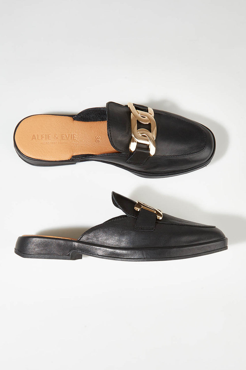 A versatile slide slip-on crafted for luxury, featuring a luxuriously soft stitched leather sock with memory foam padding and an elegantly detailed gold-trimmed mule pattern. Composed of a rich black leather upper, a wrapped black leather sole, and an exquisitely supple tan leather sock.