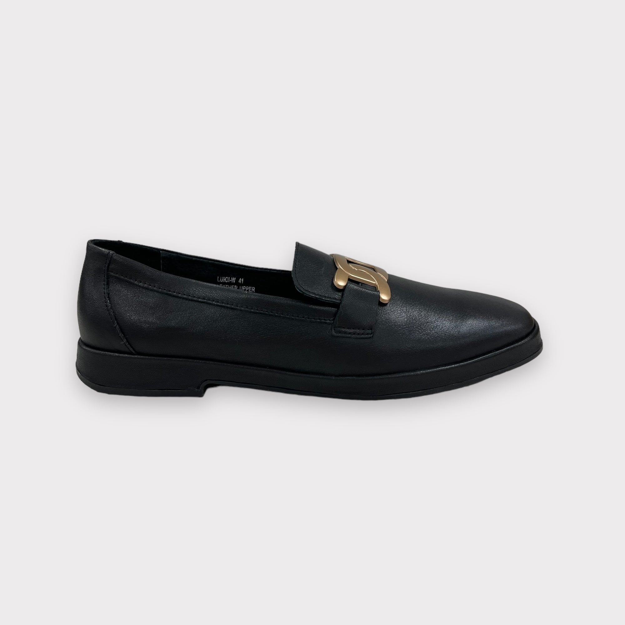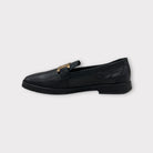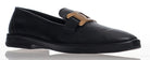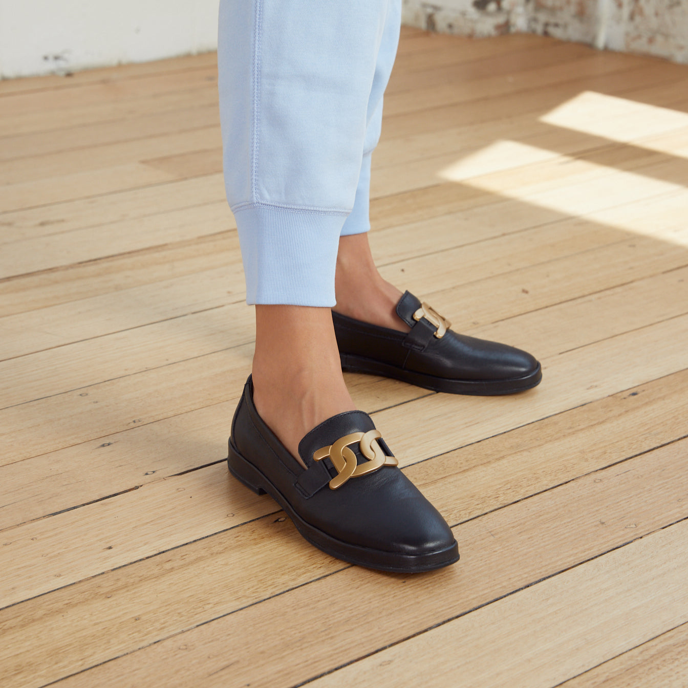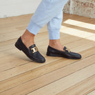 A flexible comfort feel slip-on loafer. Featuring a memory foam padded stitched leather sock and a sleek apron front vintage trimmed full loafer pattern. Combining seriously soft black leather, a wrapped black leather heel and a tan leather sock.