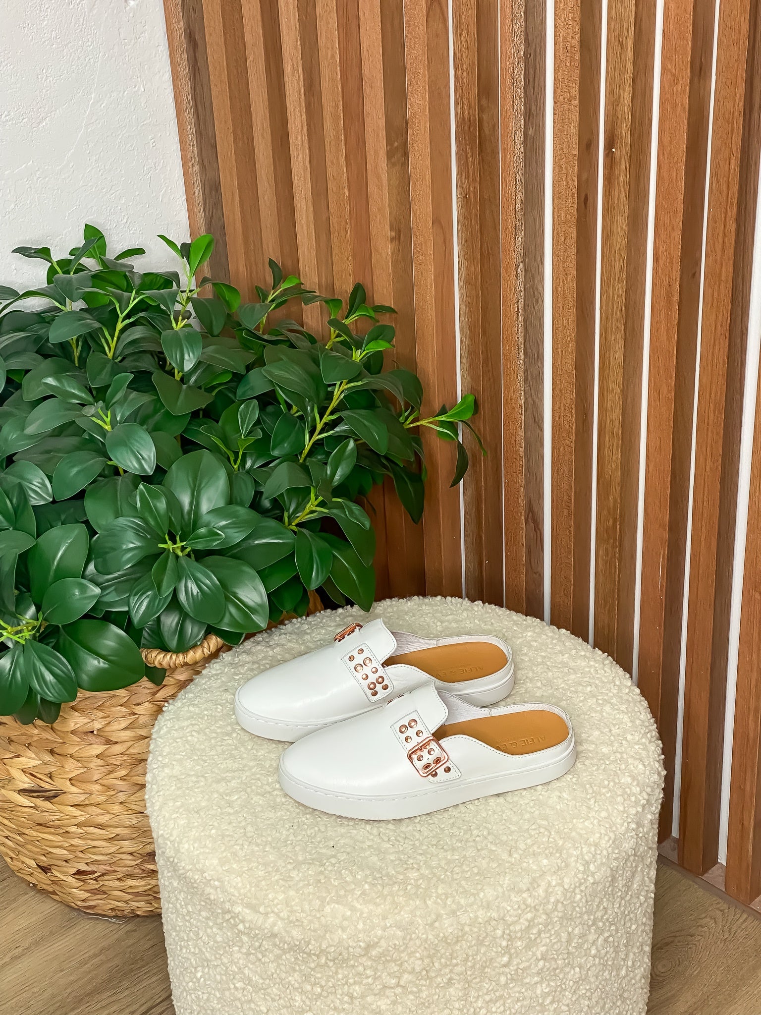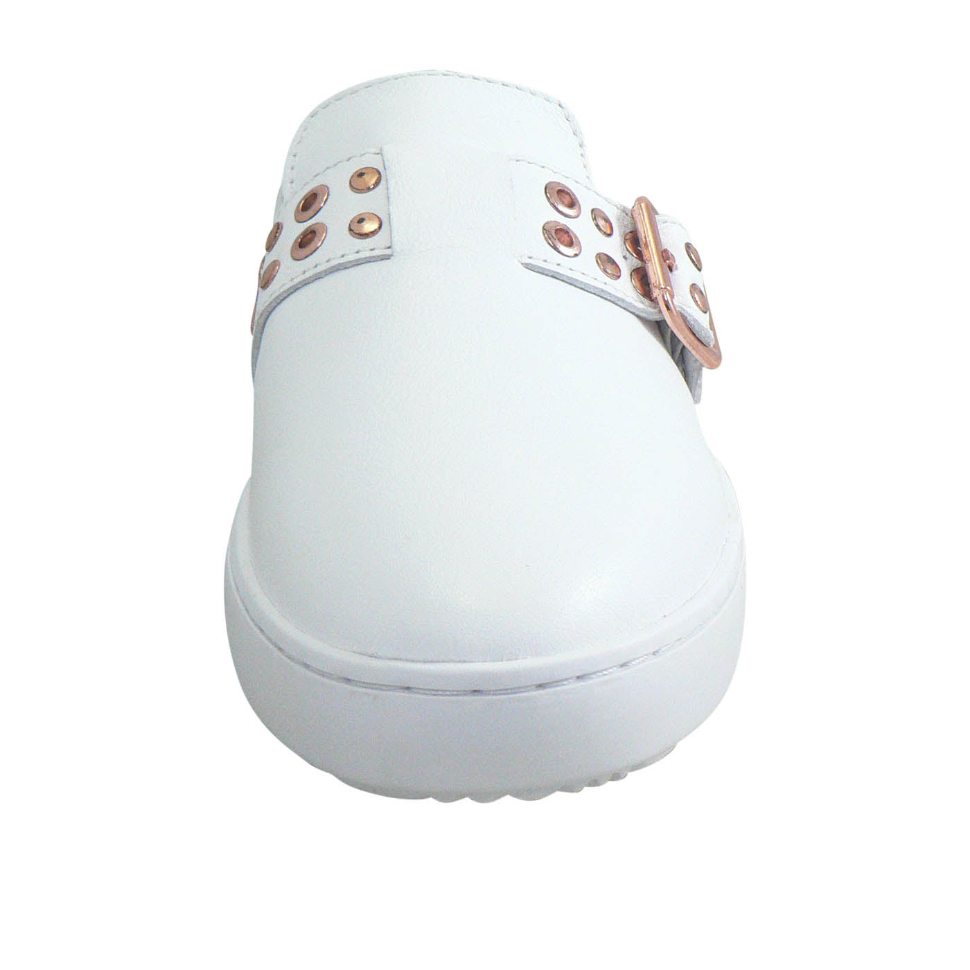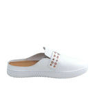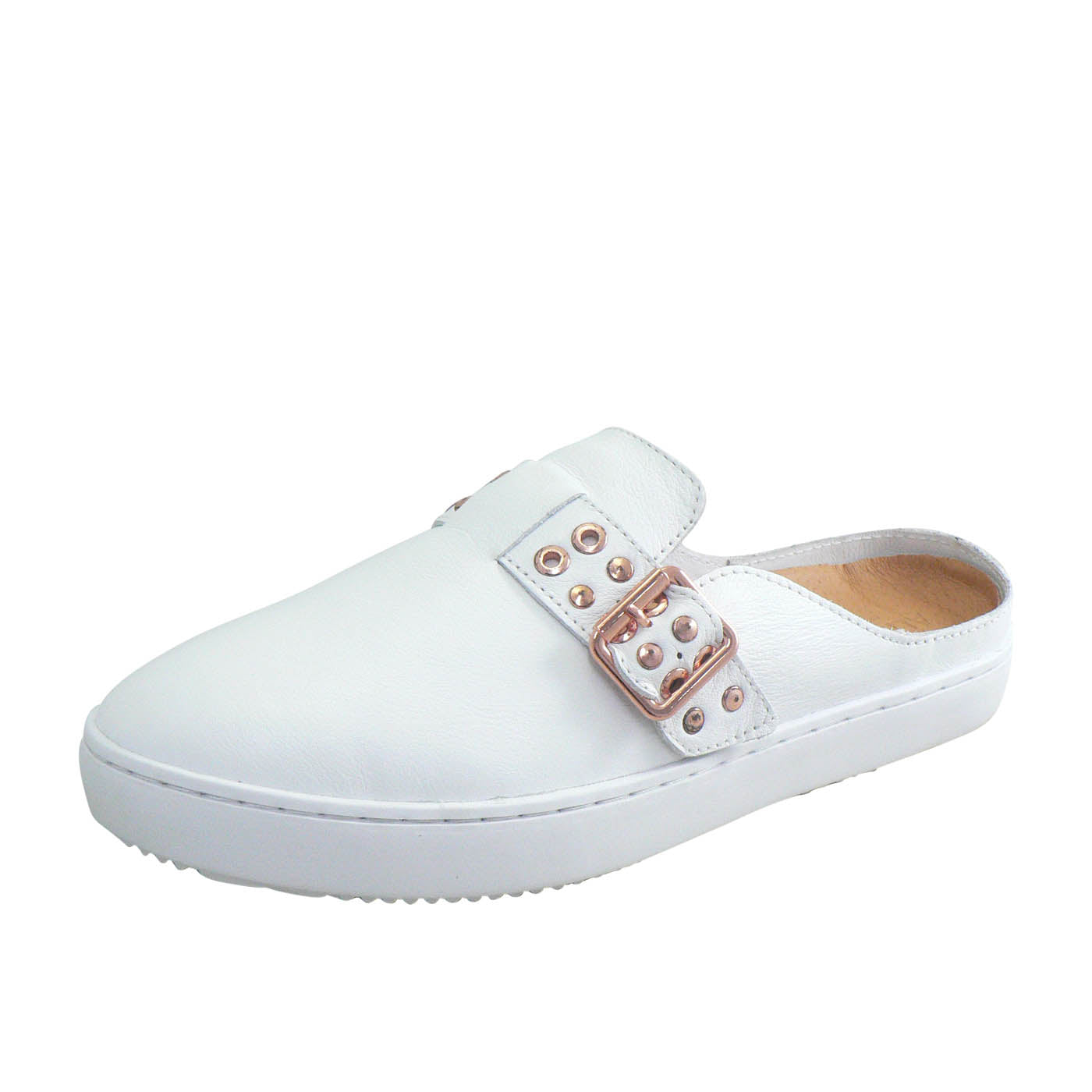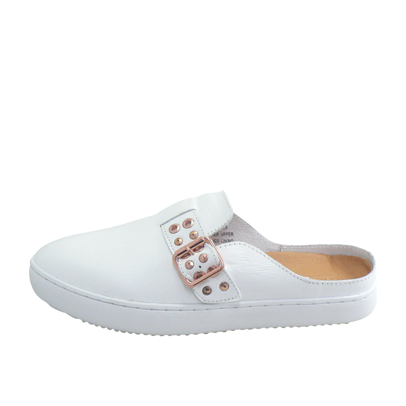 A fresh hybrid style of slide meet sneaker. Features an easy slip-on design with a buckled loafer upper. Combining classic White leather, a gold eyelet studded buckle design and a matching white sole. Featuring the iconic \"Alfie\" memory foam sock and a rubber sneaker base.