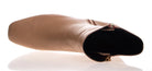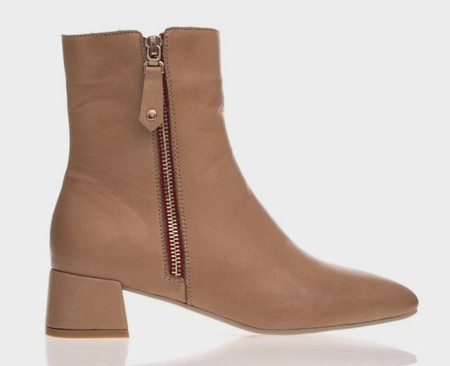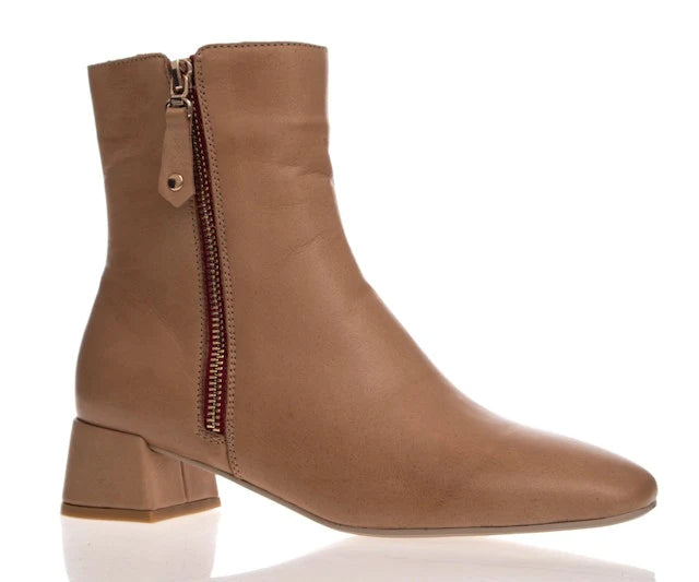 This 70’s inspired ankle boot combines a slight flared covered heel and a squared off toe. Featuring latex sock padding and an inside zip for entry. Bringing together Camel leather and an eye-catching metallic feature zip.