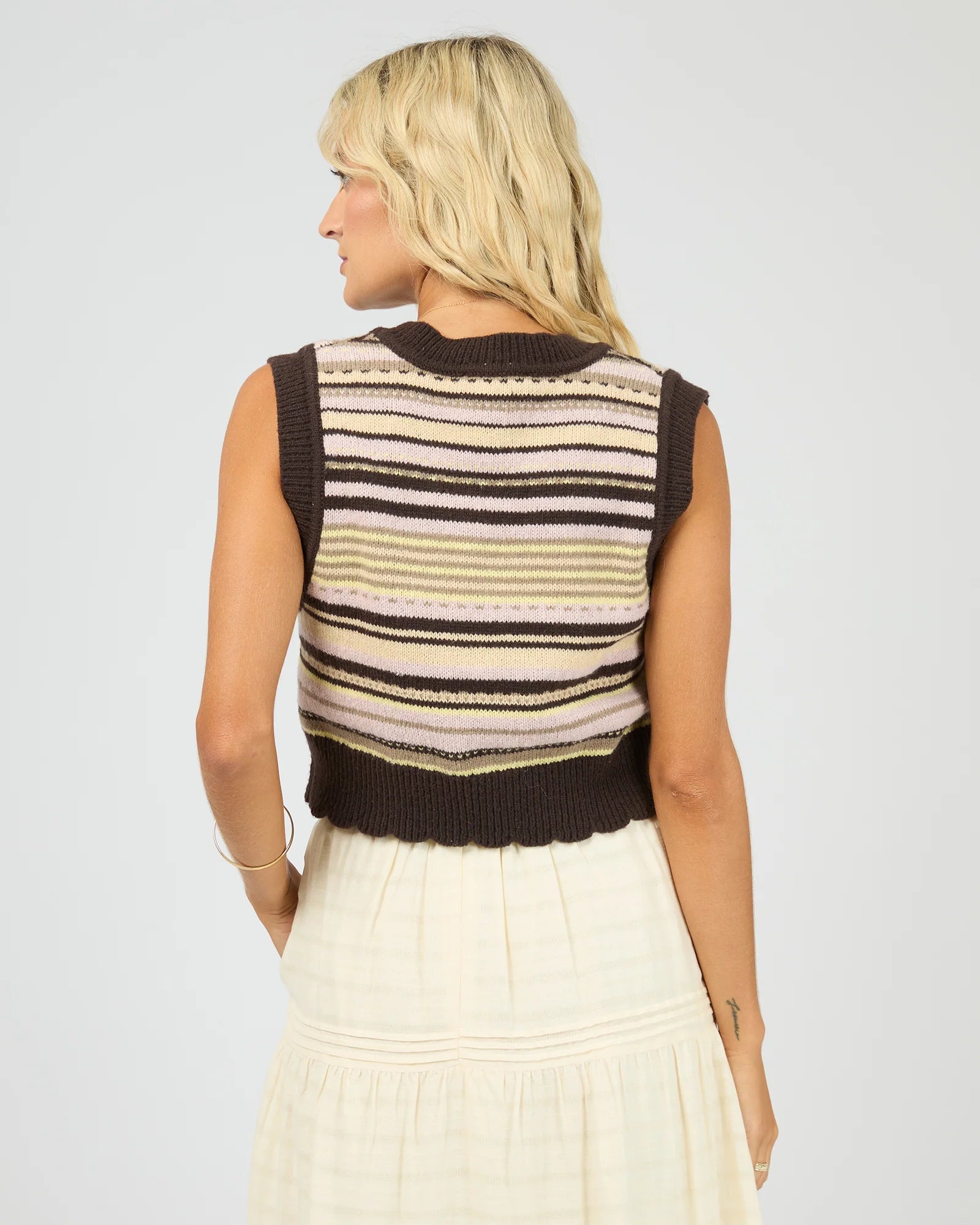 Effortlessly elevated, the Finn Vest offers a playful nod to retro styling with its bold stripe design and sleeveless silhouette. Crafted from a soft polyester knit, this piece blends lightweight comfort with structured texture, making it ideal for layering through changing seasons. The traditional knitwear construction features an intarsia stripe pattern in tonal hues for a statement yet versatile finish. Designed in a regular fit with a deep V-neckline and ribbed trims, the Finn Vest elevates denim, skirts, or tailoring for an updated vintage-inspired look.