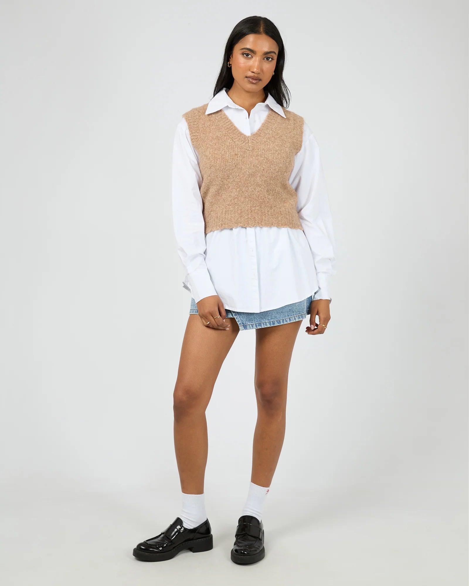 Chic and subtly sweet, this fitted knit vest features a flattering V-neckline and a delicate scalloped hem for a soft, feminine finish. The Leah Knit Vest is crafted in a comfy fluffy knit blend yarn, it hugs close to the body perfect for layering or wearing on its own. Pair over a skirt and some denim bottoms to create the perfect cottage core look.