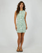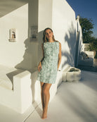 The Lucia Mini Dress is a fresh take on everyday dressing, crafted from a breathable cotton flax blend in sage green with a soft white organic geometric pattern. Featuring a high neckline, button-down front, and sleeveless cut, it’s equal parts structured and easygoing. Style it with sandals or wedges for a crisp, warm-weather look made for sunny days out.