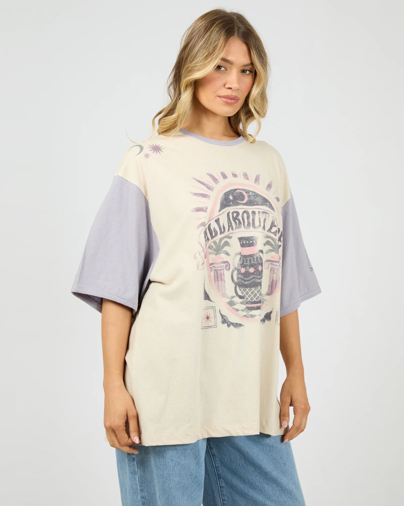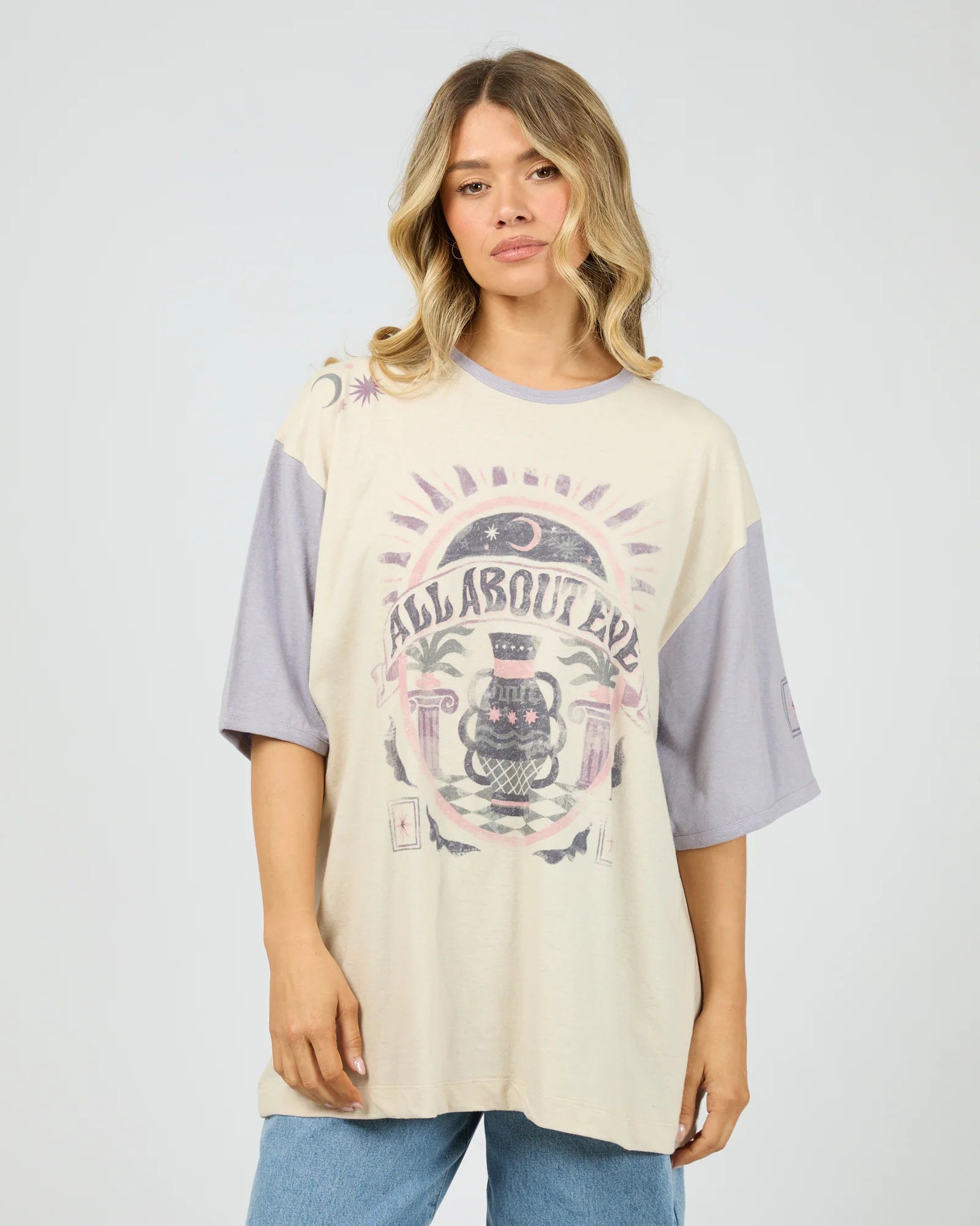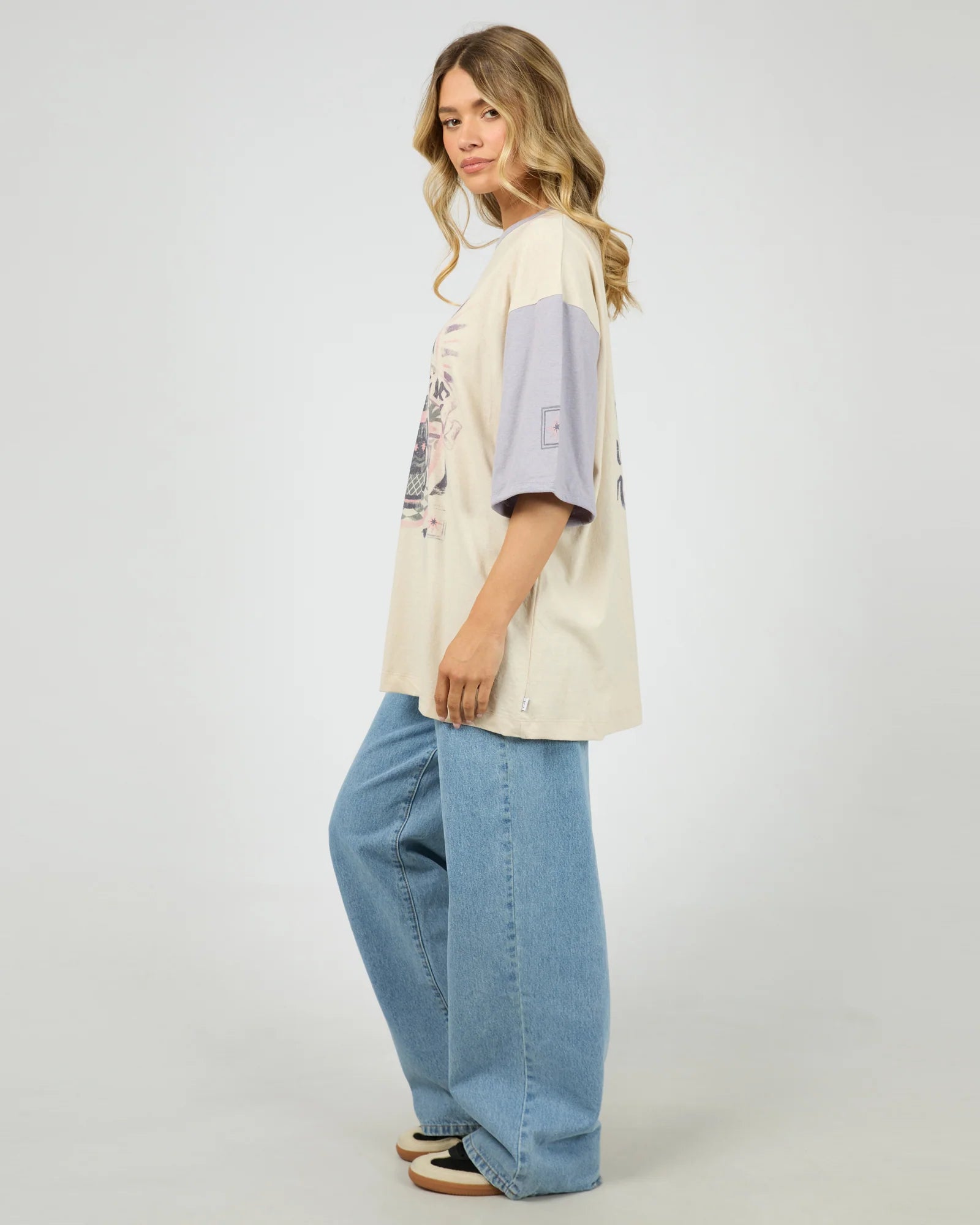 The Moondust Oversized Tee in Vanilla is a casual piece with an effortless, lived-in feel. Designed in an oversized fit, it drapes loosely through the body and sleeves for relaxed, everyday comfort. Crafted from a breathable cotton–hemp blend, it feels lightweight and soft against the skin while offering a natural texture. Finished with an All About Eve exclusive front and back graphic and a vintage wash, this tee delivers a worn-in look with personality.