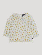 The Jasmine Long Sleeve Tee is made from 93% Viscose / 7% Elastane, in a rib fabric, and features an all over garment wash for soft handfeel. The tee features an all over floral yardage print has a self fabric neckband with frill. The sleeves and hem finished with a babylock wave effect, and a branded flag label attached in the side seam