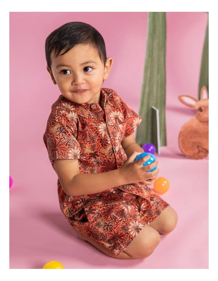The Native Short by Animal Crackers is made from yardage printed 100% cotton material. It features an earth coloured jungle/animal print, relaxed fit, elastic waist with drawstring, back pockets, and branded badge. Team back with the Native Shirt for the ultimate summer style.