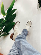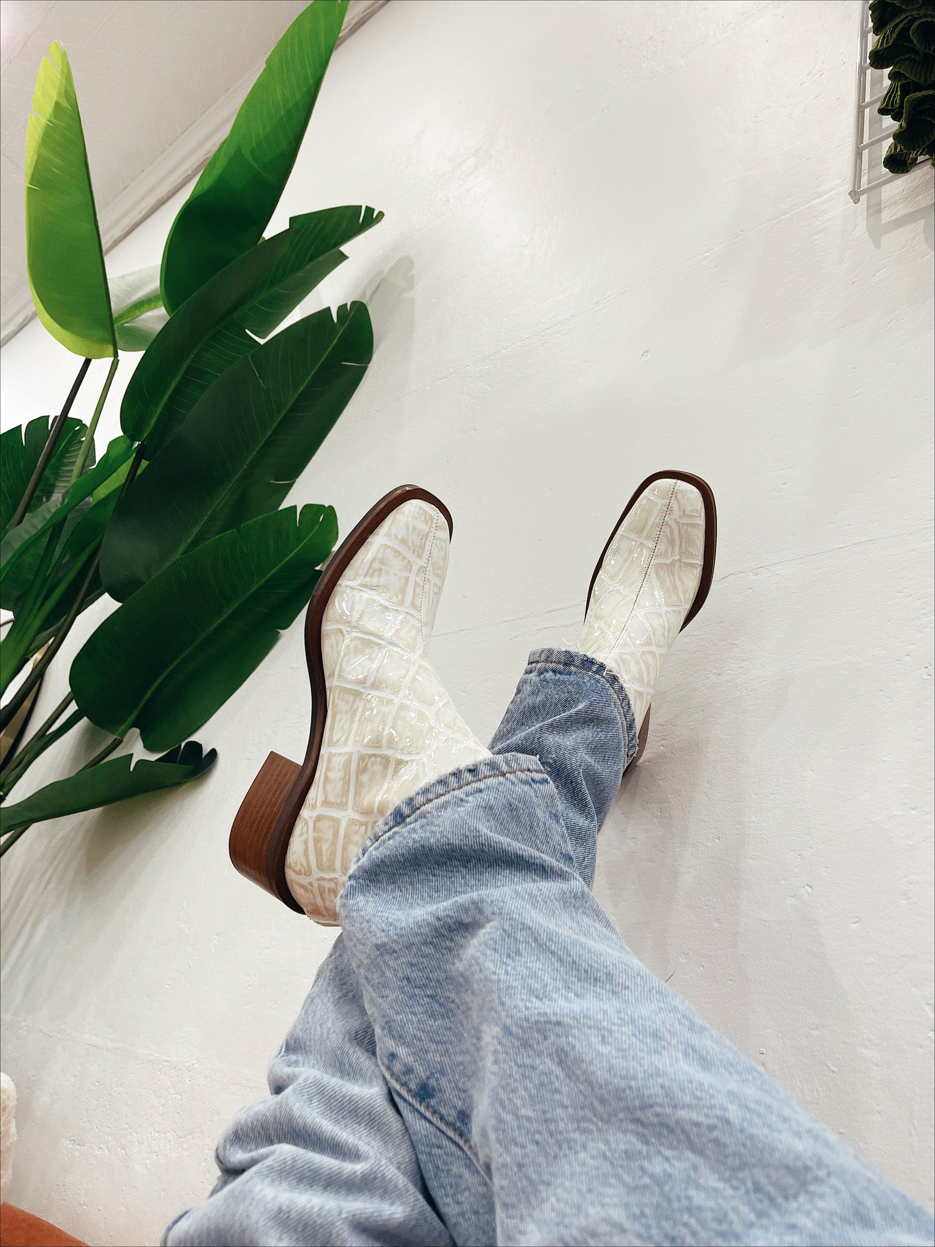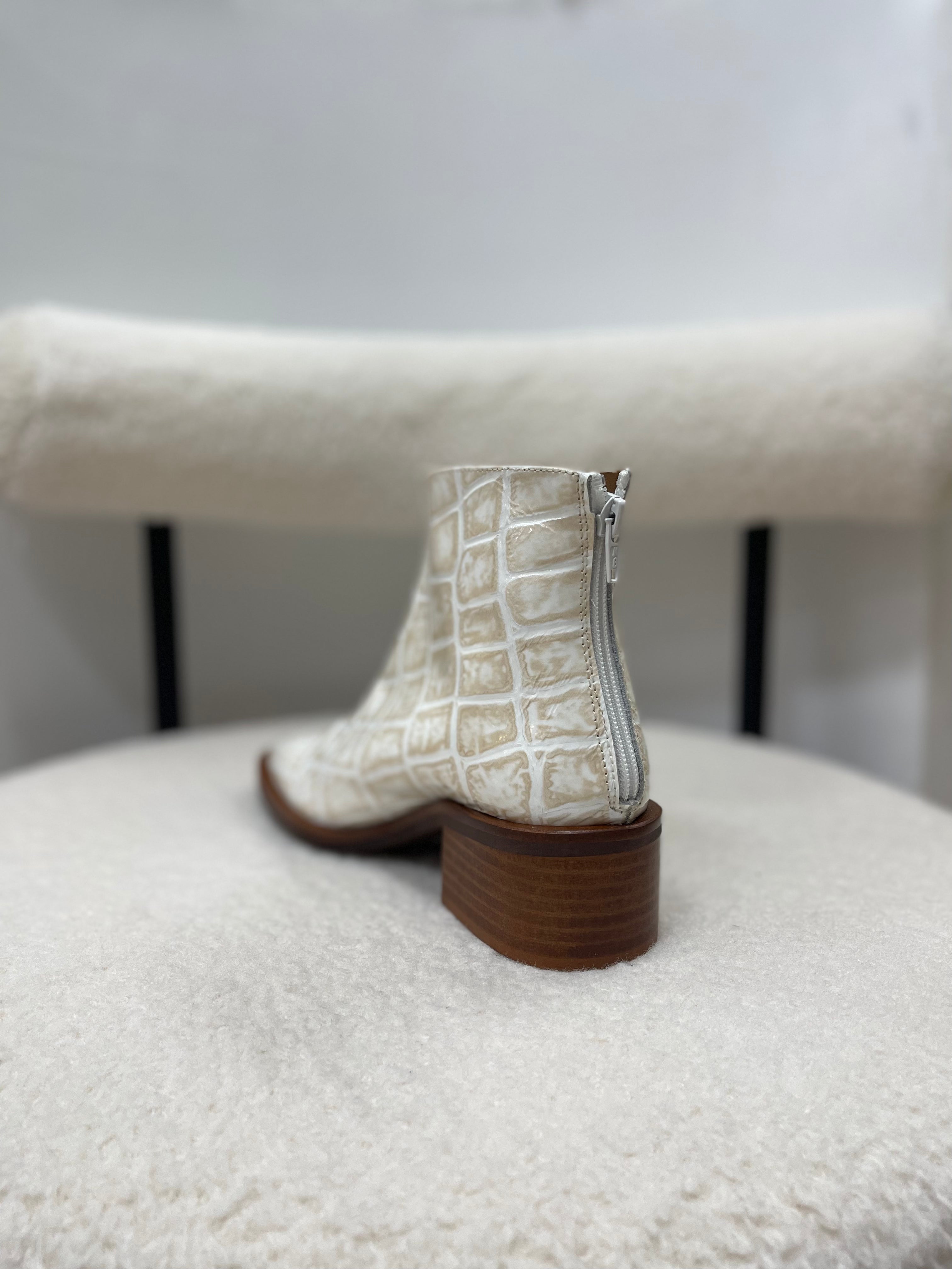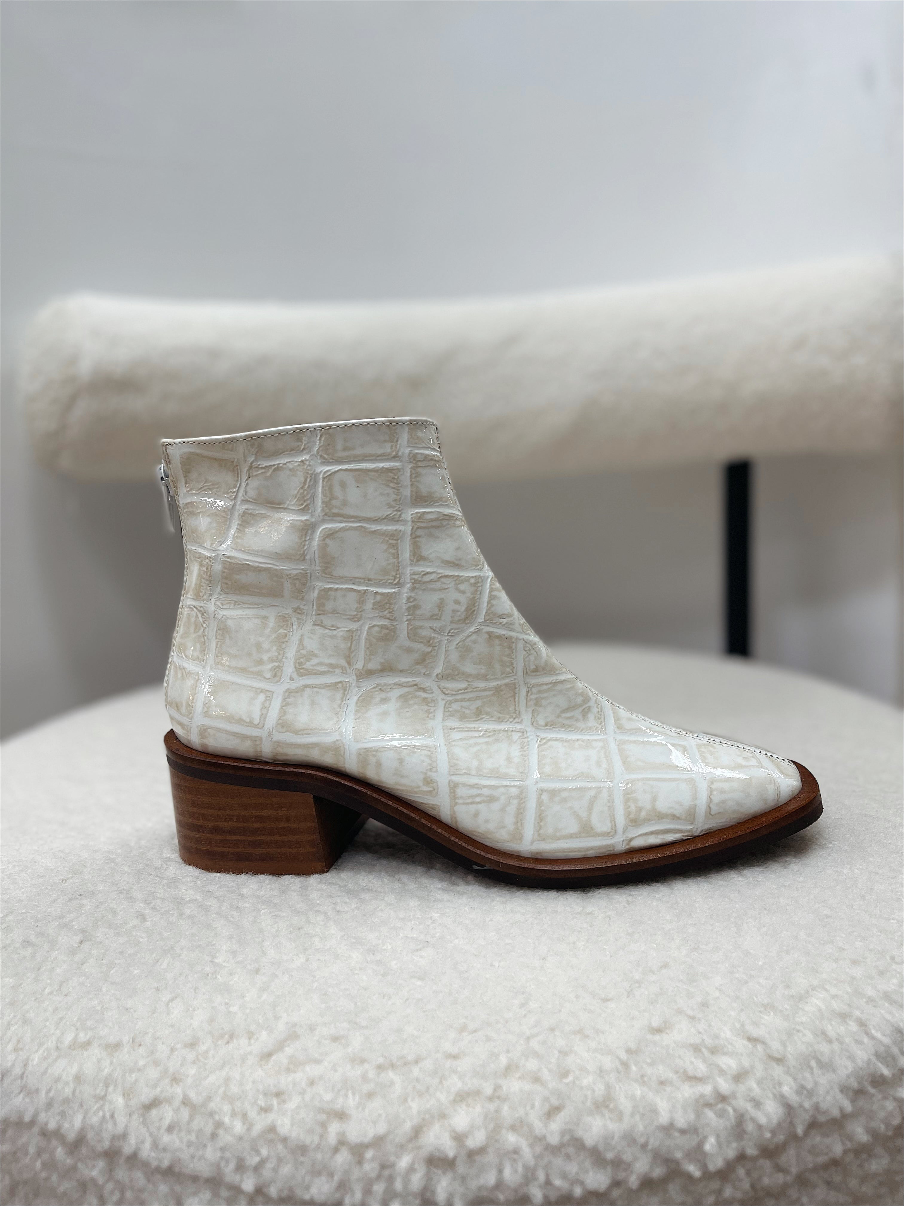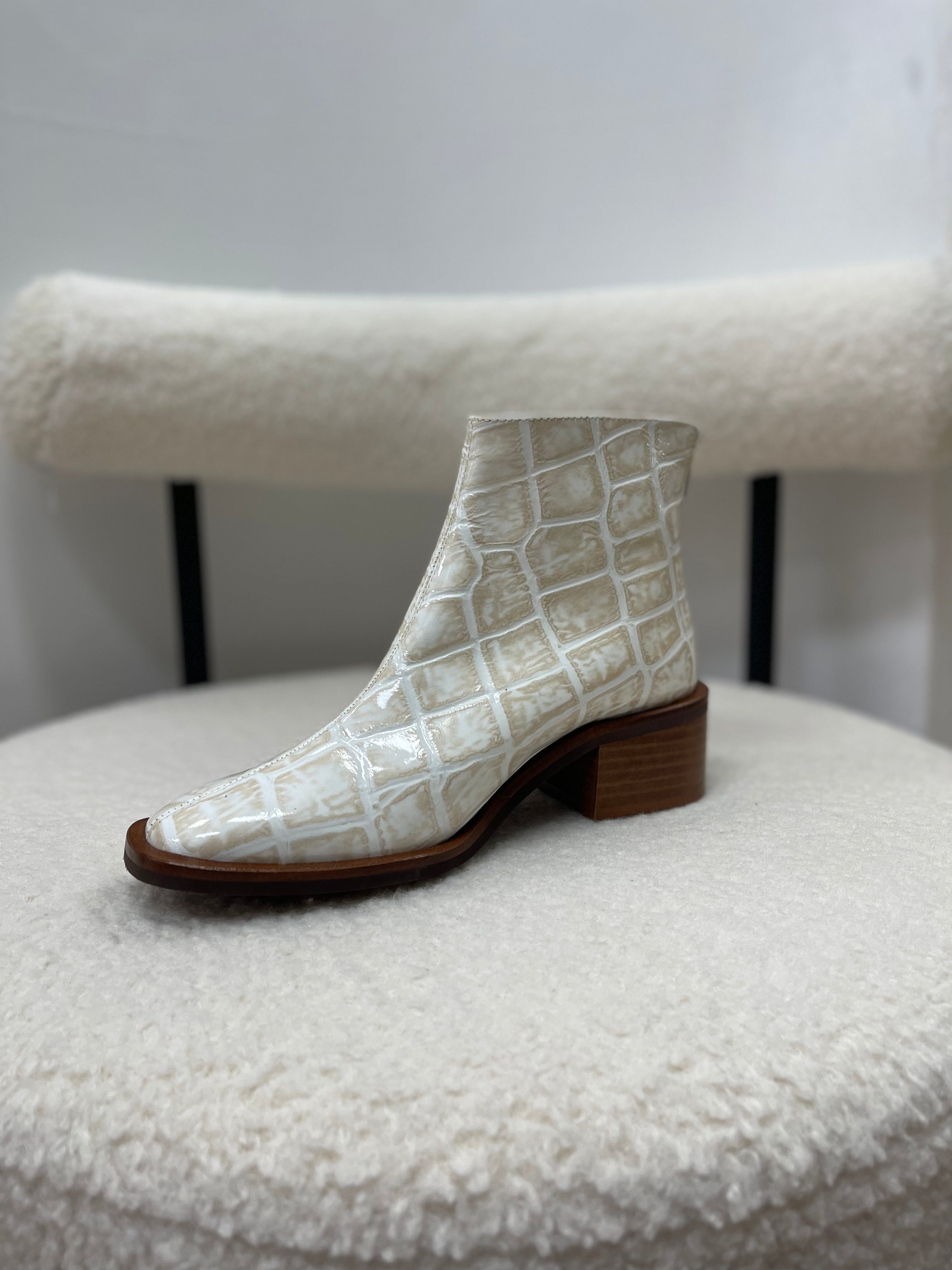 Step out in style with JAX by Marian. This is gorgeous ankle boot is perfectly paired with jeans or dresses. Made in Spain with the most luxurious patent leather, in a beautiful croc embossed print. The mix of beige and ivory keeps this boot looking soft while the square toe gives off a masculine silhouette.
