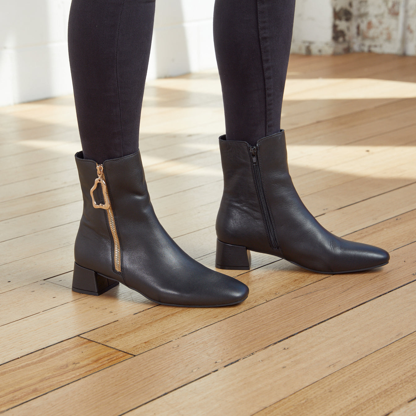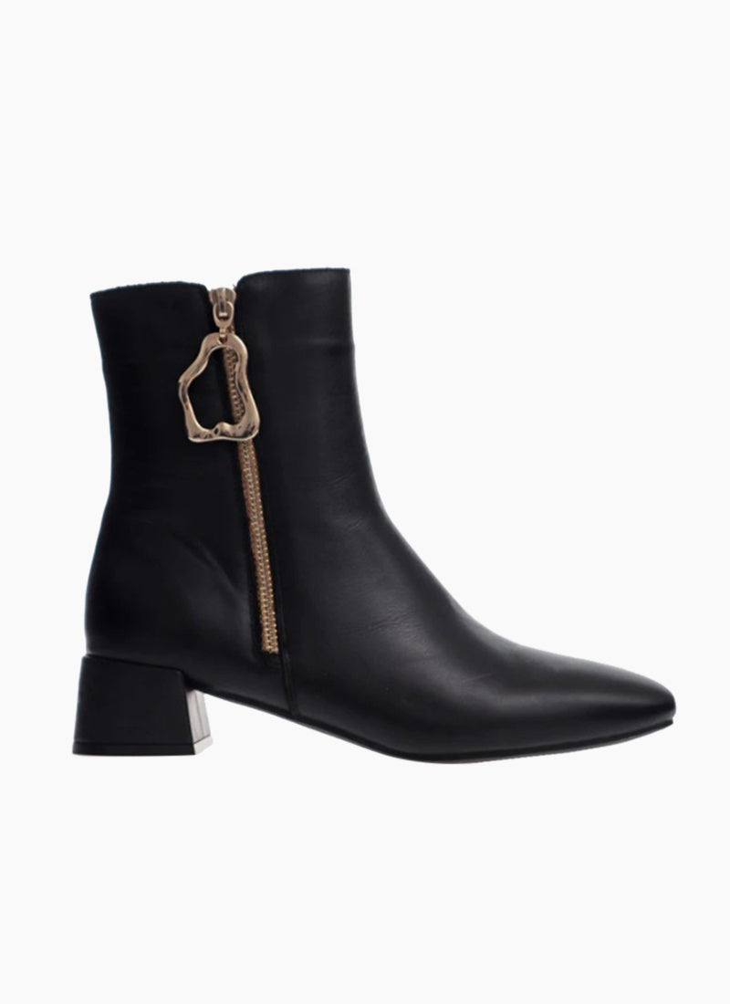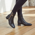 Stride in style with Wentworth - Black, a classic pair of mid-rise black boots, detailed with a gold buckle and double zipper for a sleek and sophisticated look. These boots, crafted with a low heel, promise all-day comfort with an air of luxury.