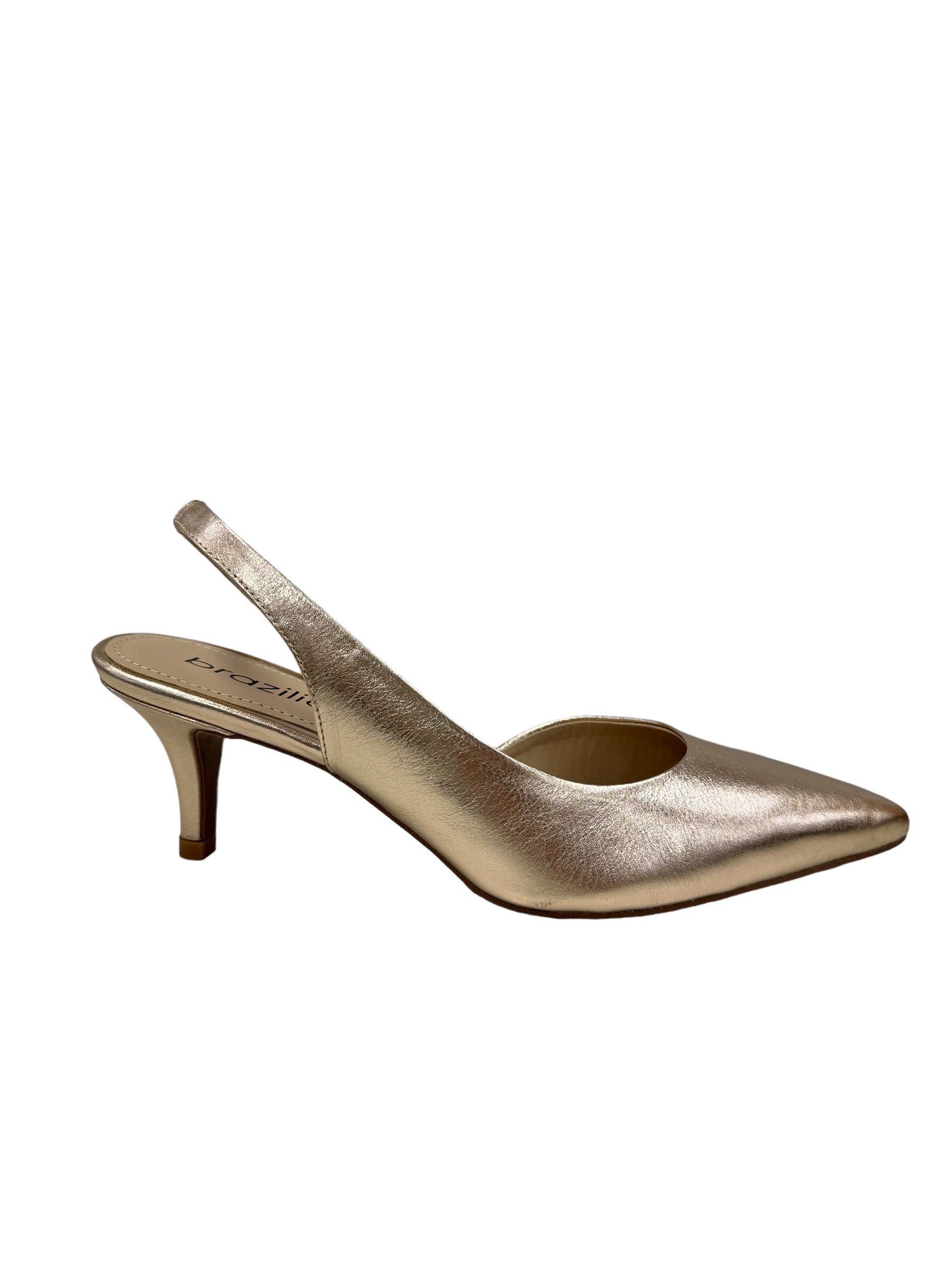 The playful Bretta shoes feature soft gold leather kitten heel and a sleek sling black design, perfect for adding a touch of glamour to any outfit. Made in Brazil, these unique heels will make a statement wherever you go.