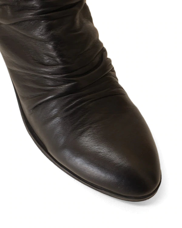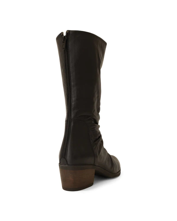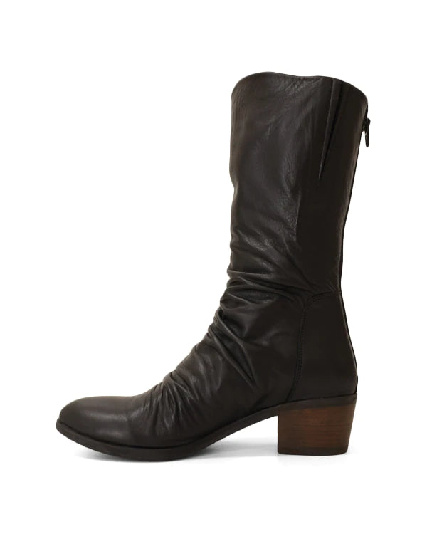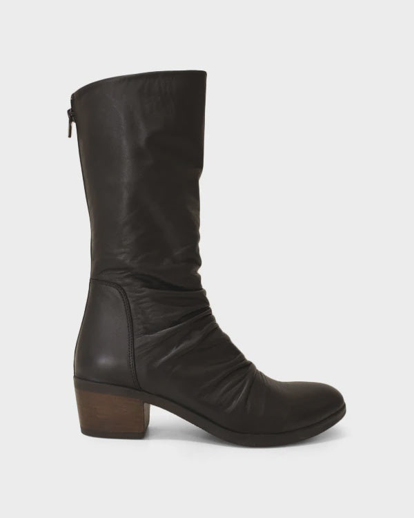 A gorgeous soft leather, mid calf boot. Round toe shape, with a ruched leather feature. Fasten this boot with a rear zipper. You will love Gemi