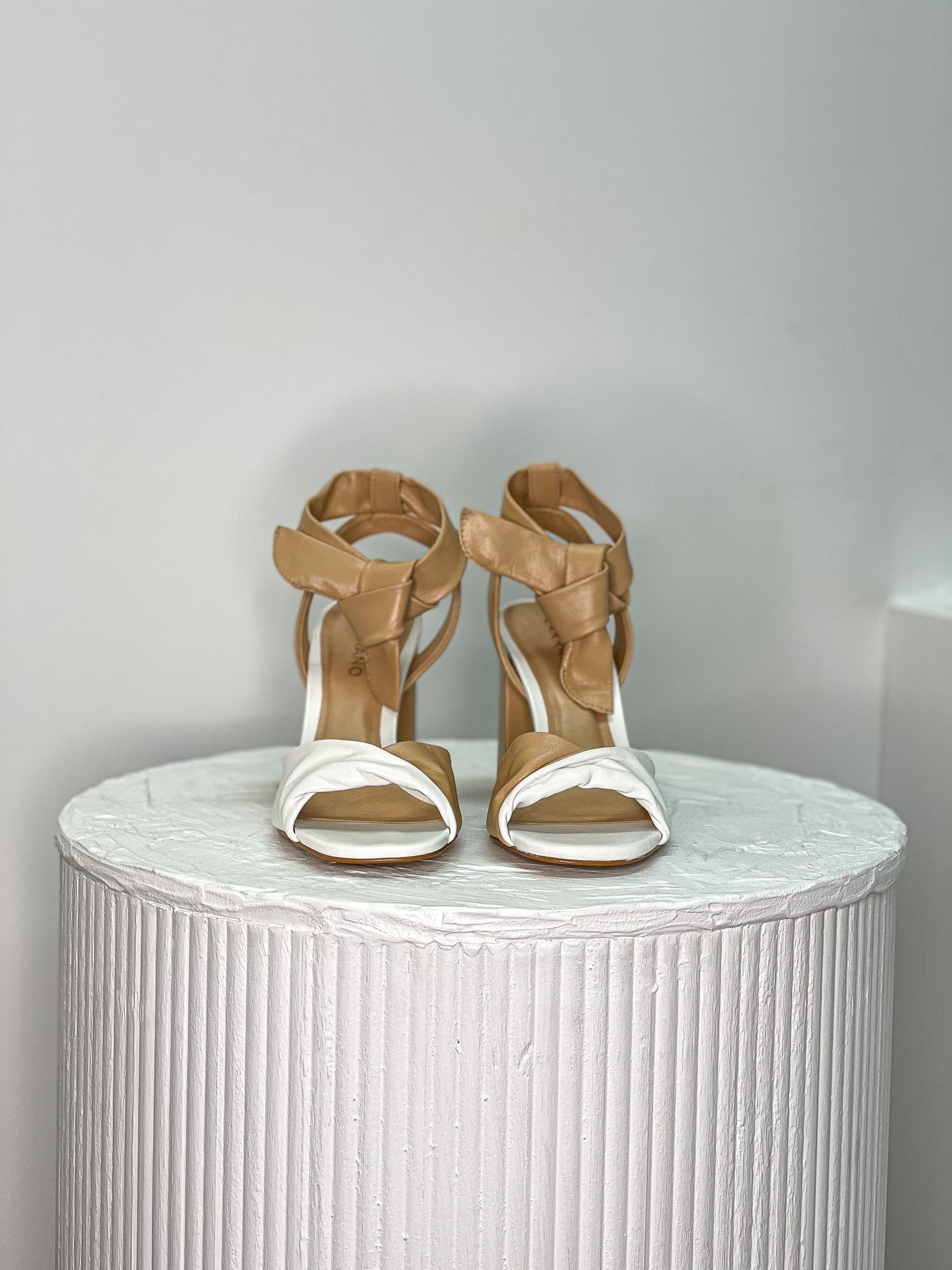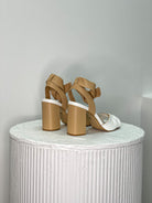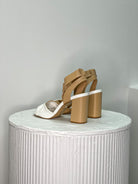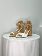 Step out in style in these gorgeous Banka Leather Heels! These chic shoes come in a stunning tan and white mix, with a block heel and soft leather to keep you comfortable all day. Plus, the tie up around the ankle adds an extra oomph of elegance! Rock these on a night out .