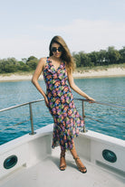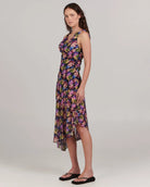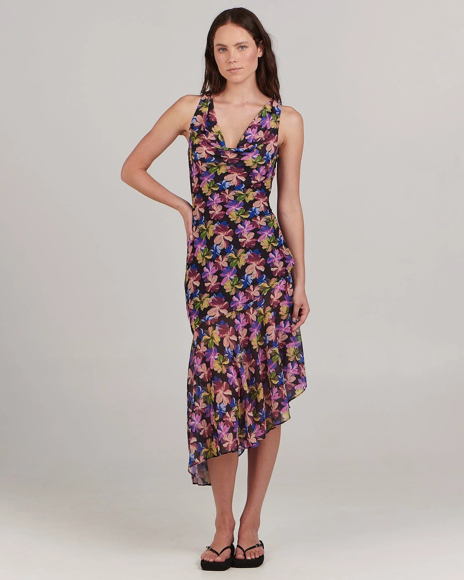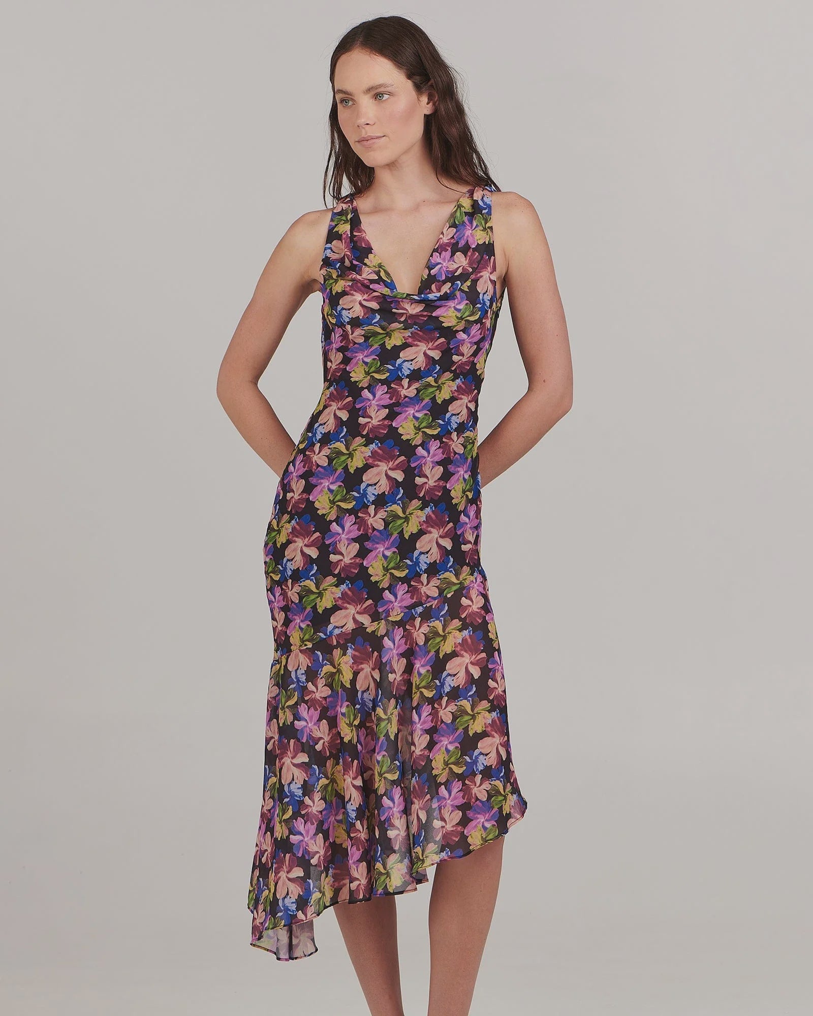 With its cowl neck and asymmetrical hemline that falls beautifully, this gorgeous piece is the ideal occasion dress in a beautiful dark floral. Wear it with heels and a box clutch for an evening out.