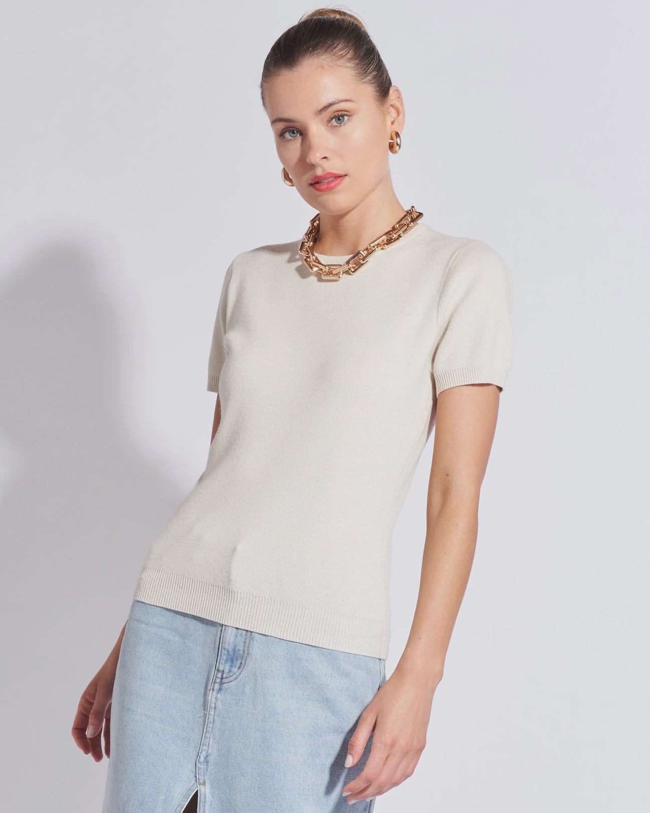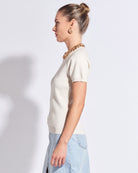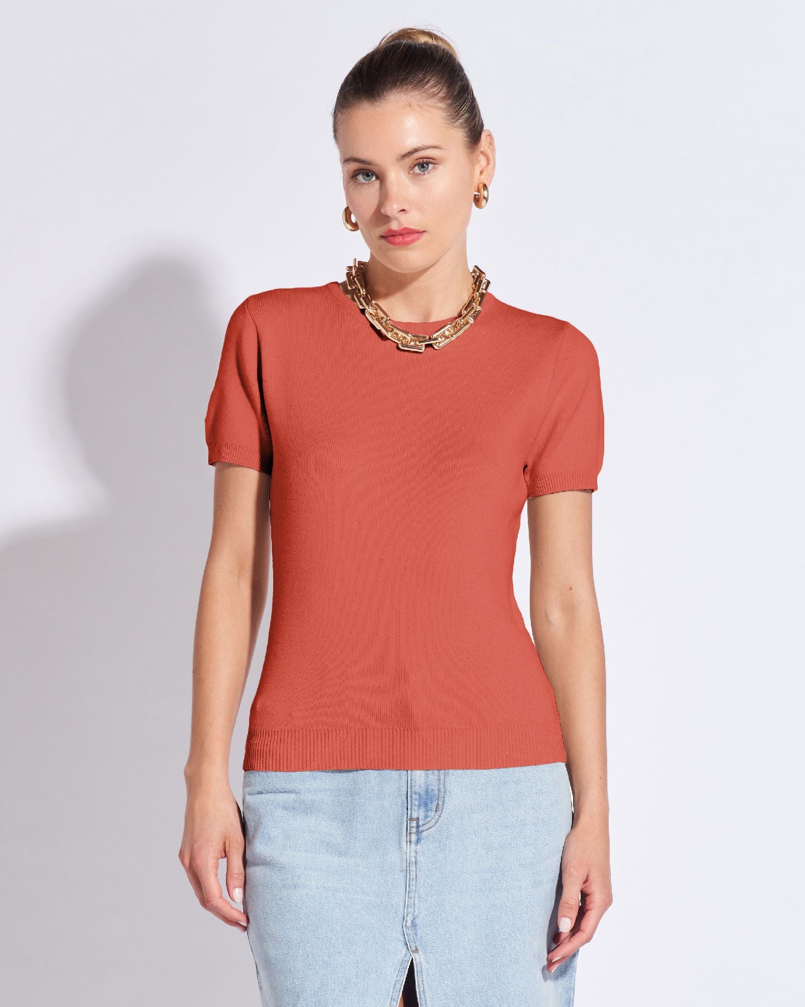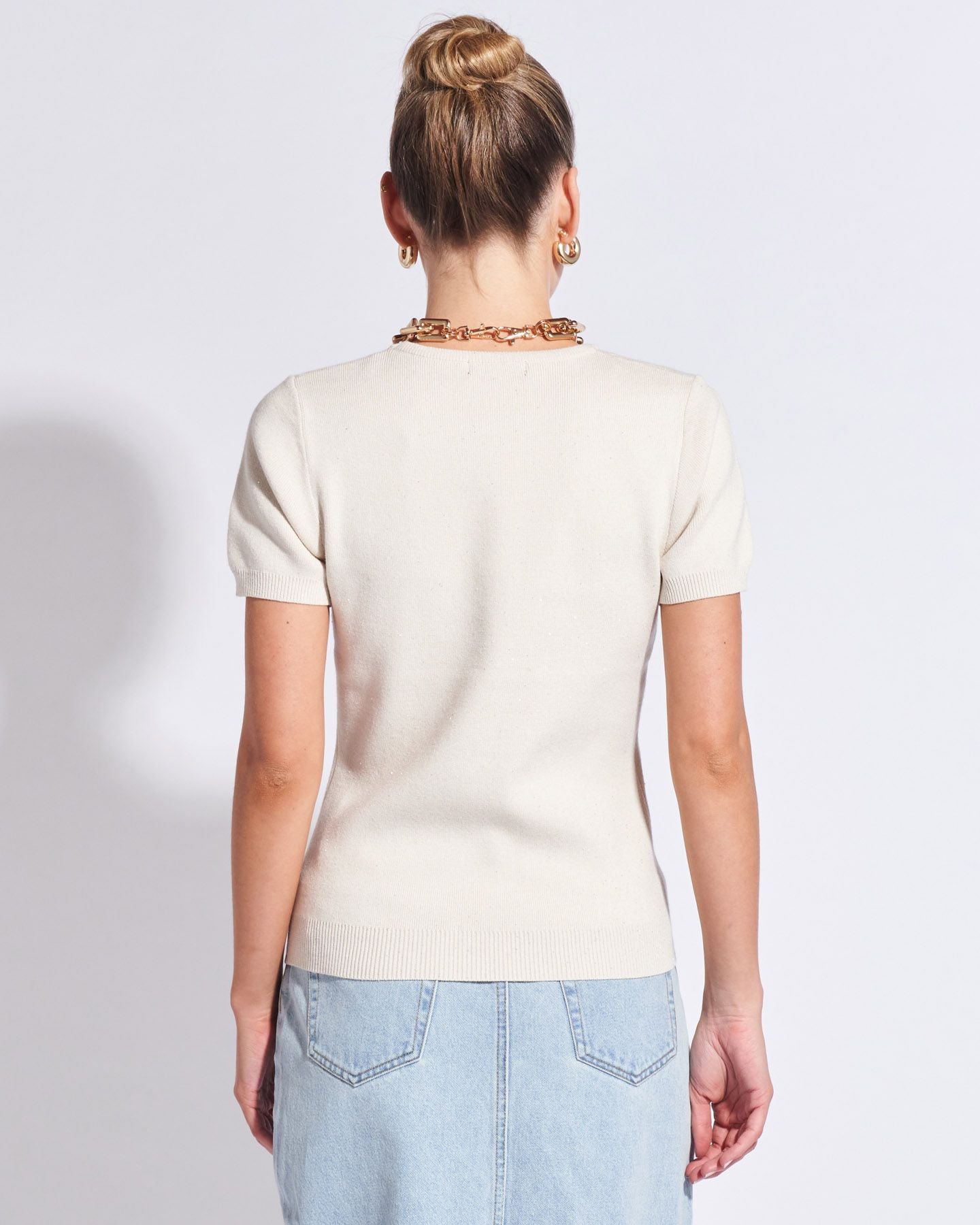 The La Luna knit is a little bit dressed up. This knit top fits close to the body and has a ribbed round neckline. Wear yours from day to night with the extra sparkle.