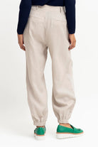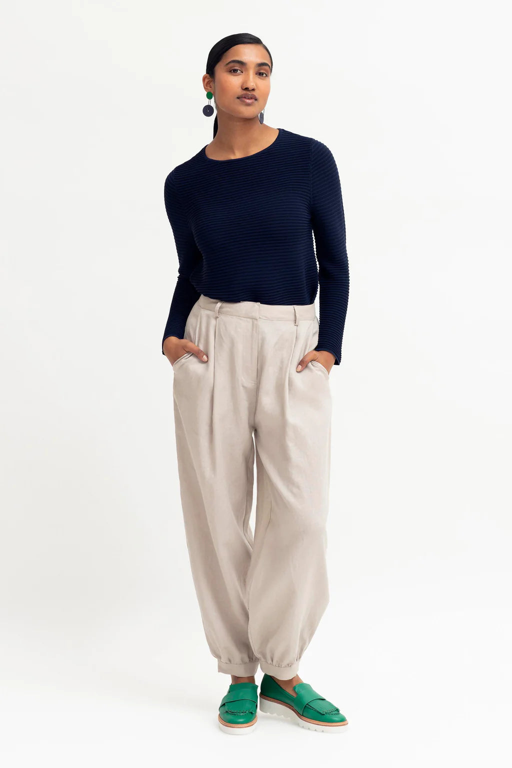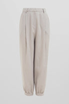 Crafted from French linen, the Taye Pant has a fixed waistband with belt loops and front tucks that drape down the leg into a narrow-fit elastic ankle cuff creating a distinctive shape. With angled front pockets and faux welt pockets at the back, the pant features a front zip fly with a metal hook and eye closure creating a new take on tailored pants.