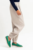 - Relaxed-fit pant gathers into a narrow-fit cuff at the ankle
