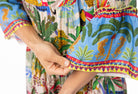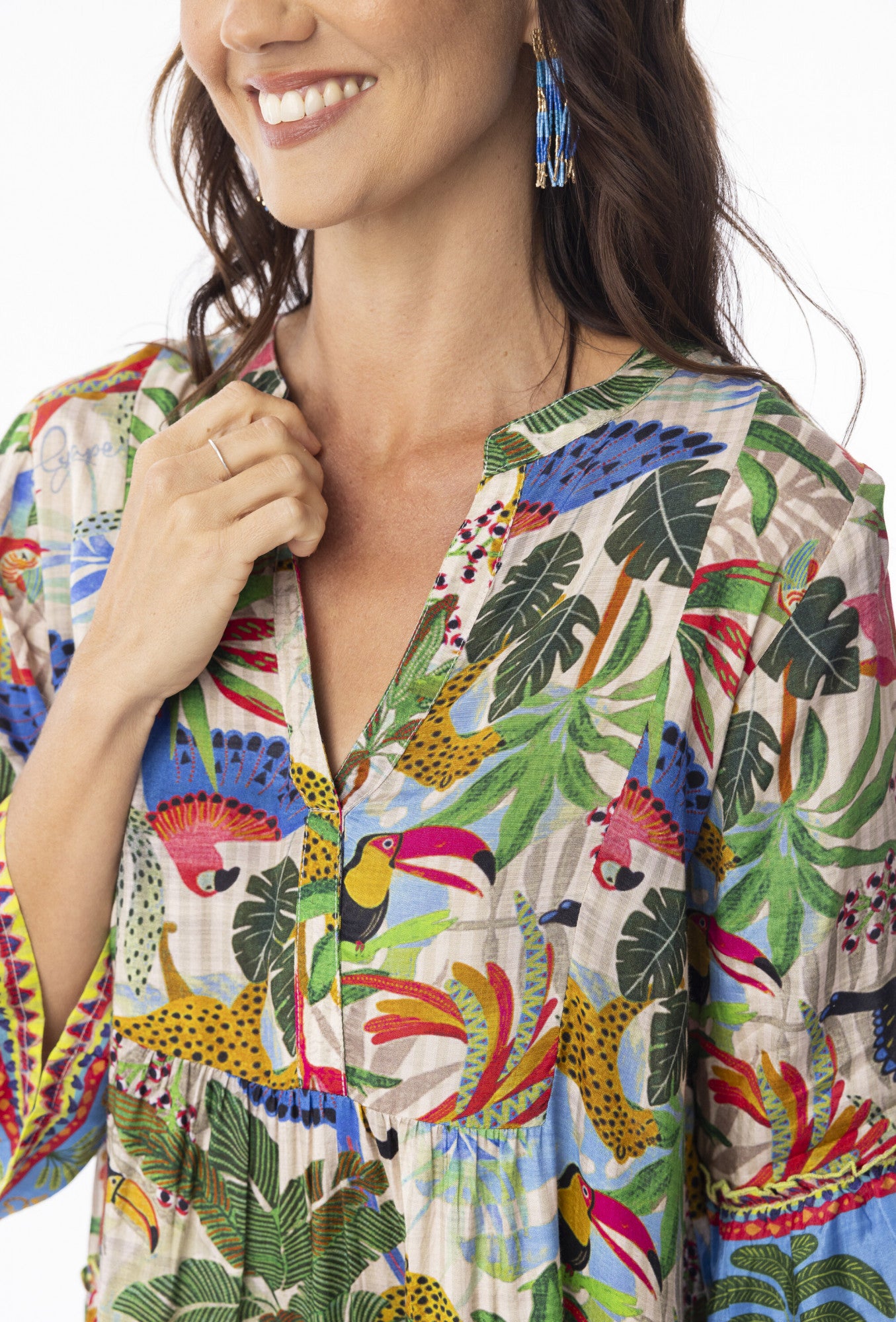 Be transported by the horizon-chasing Dani Layered Frill Sleeve Dress. Featuring an Amazonian flora and fauna print, button up mandarin collar, a frill tiered skirt that falls at the knee, three-quarter frill sleeves, and unique hand drawn prints, this dress is so easy to wear. The perfect dress for soaking up the sun on a warm summer day!