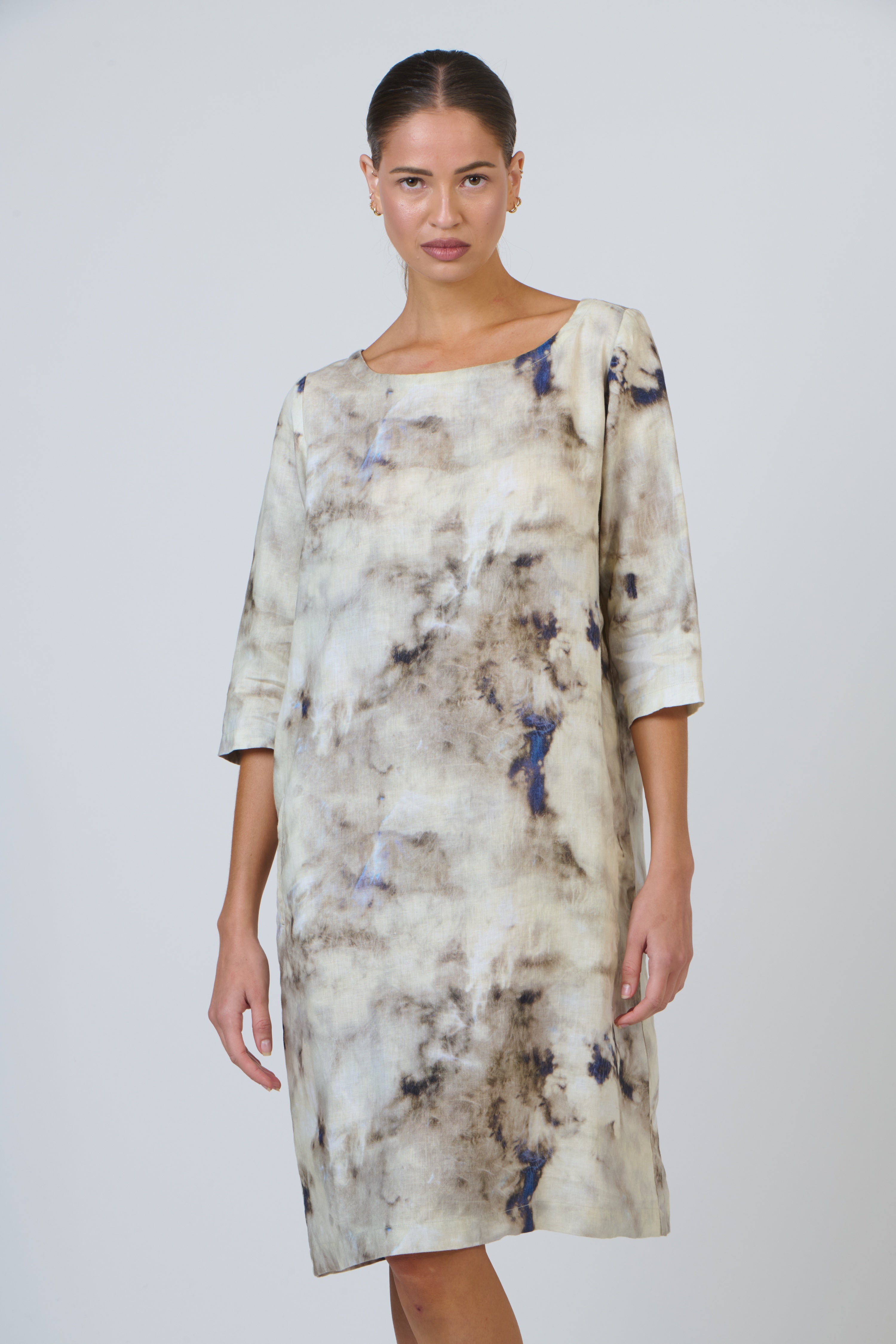 A dress to meet the seasons. GA486 is a knee-length linen dress with a boat neck, concealed pockets, and sleeves that gently cover the elbow. Made from 100% linen with a relaxed design, it can be just as easily worn on a warm autumn day or taken into the cooler months when paired with boots and a jacket.