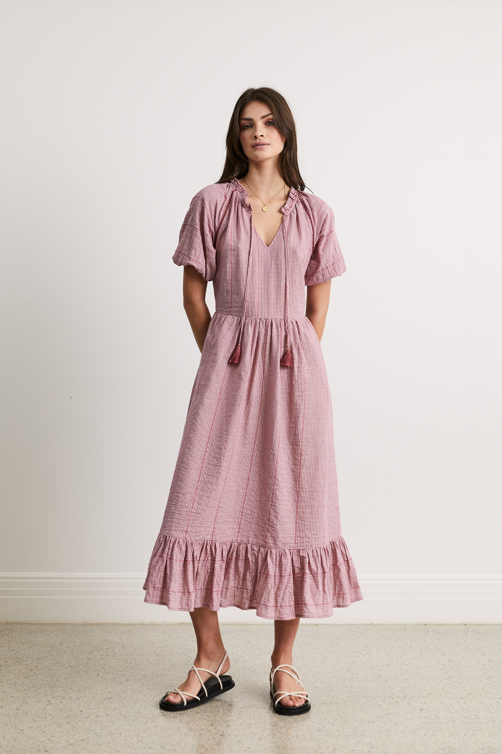 The Lilly Midi Dress is crafted in our beautiful cotton blend Mulberry Gingham fabrication. Featuring self neck ties with tassel ends.