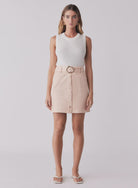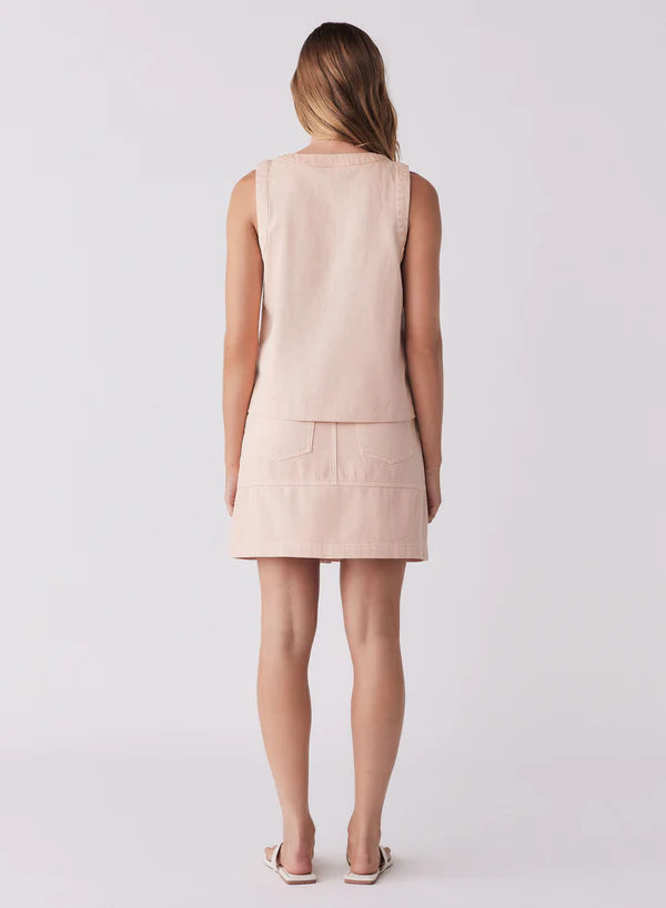 The Esmaee Cruising Denim Skirt in soft coral brings a fresh twist to your wardrobe with its playful high-waisted fit and mid-thigh length. Featuring handy side and back pockets, eye-catching gold buttons, and stylish topstitching panels, it’s designed for both function and flair. The removable waist belt lets you switch up your look, while the 100% cotton fabric ensures comfort all day. Mindfully created, this skirt is perfect for cruising through your day with effortless style.