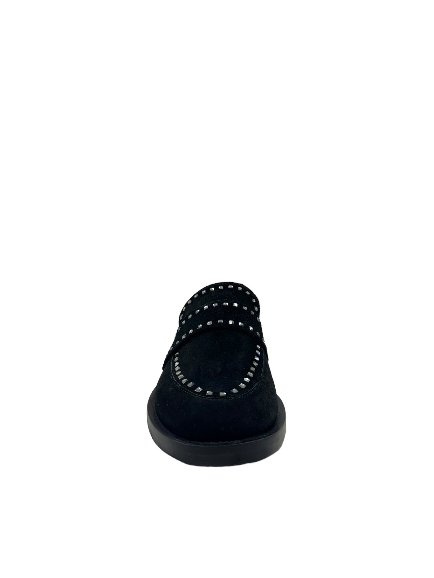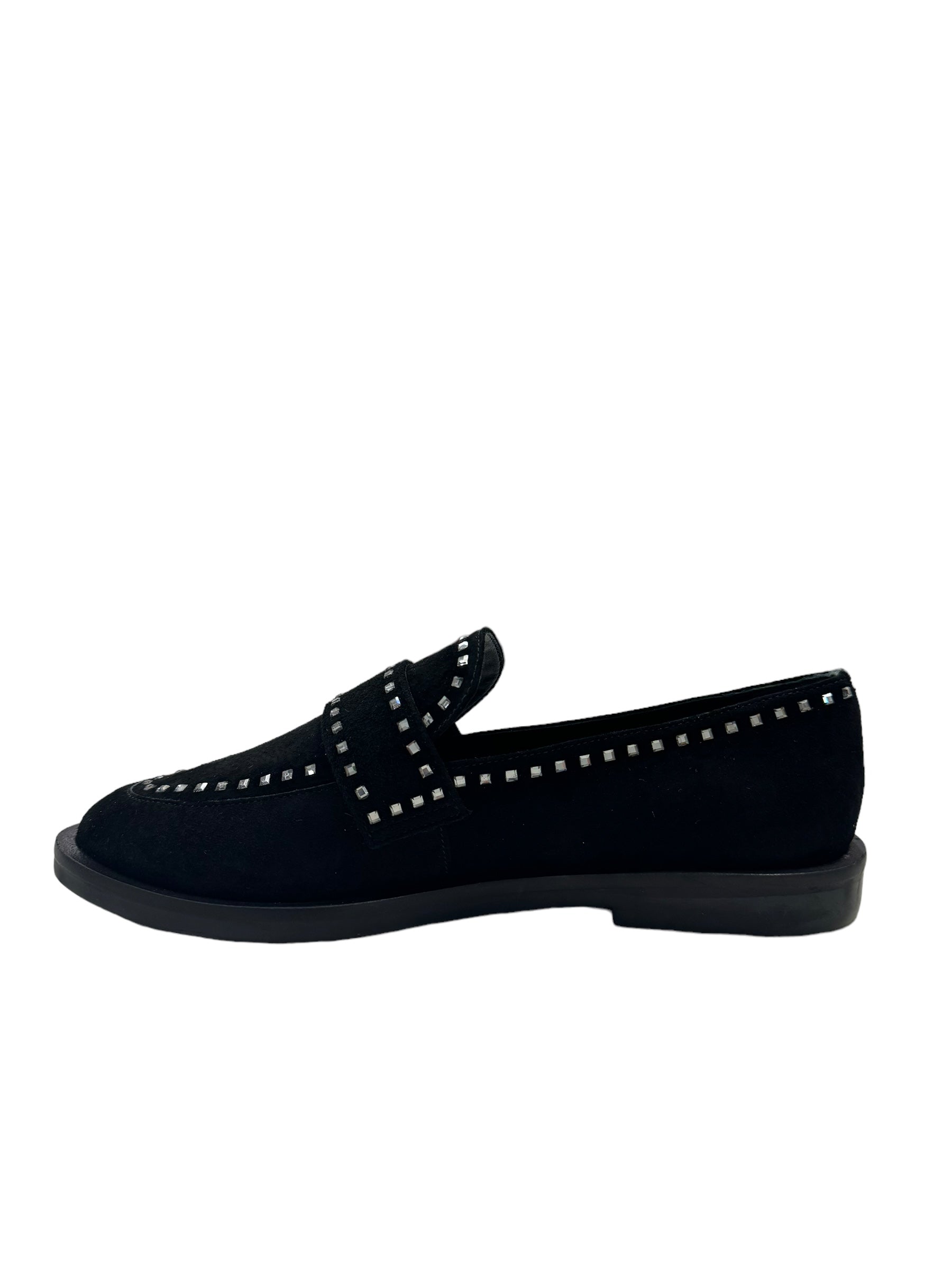 Unleash your bold side with Lucy - Black. These stylish black suede loafers are adorned with dazzling rhinestone detailing, making them perfect for those who love to take risks and stand out. Dare to be different and add some sparkle to your step!