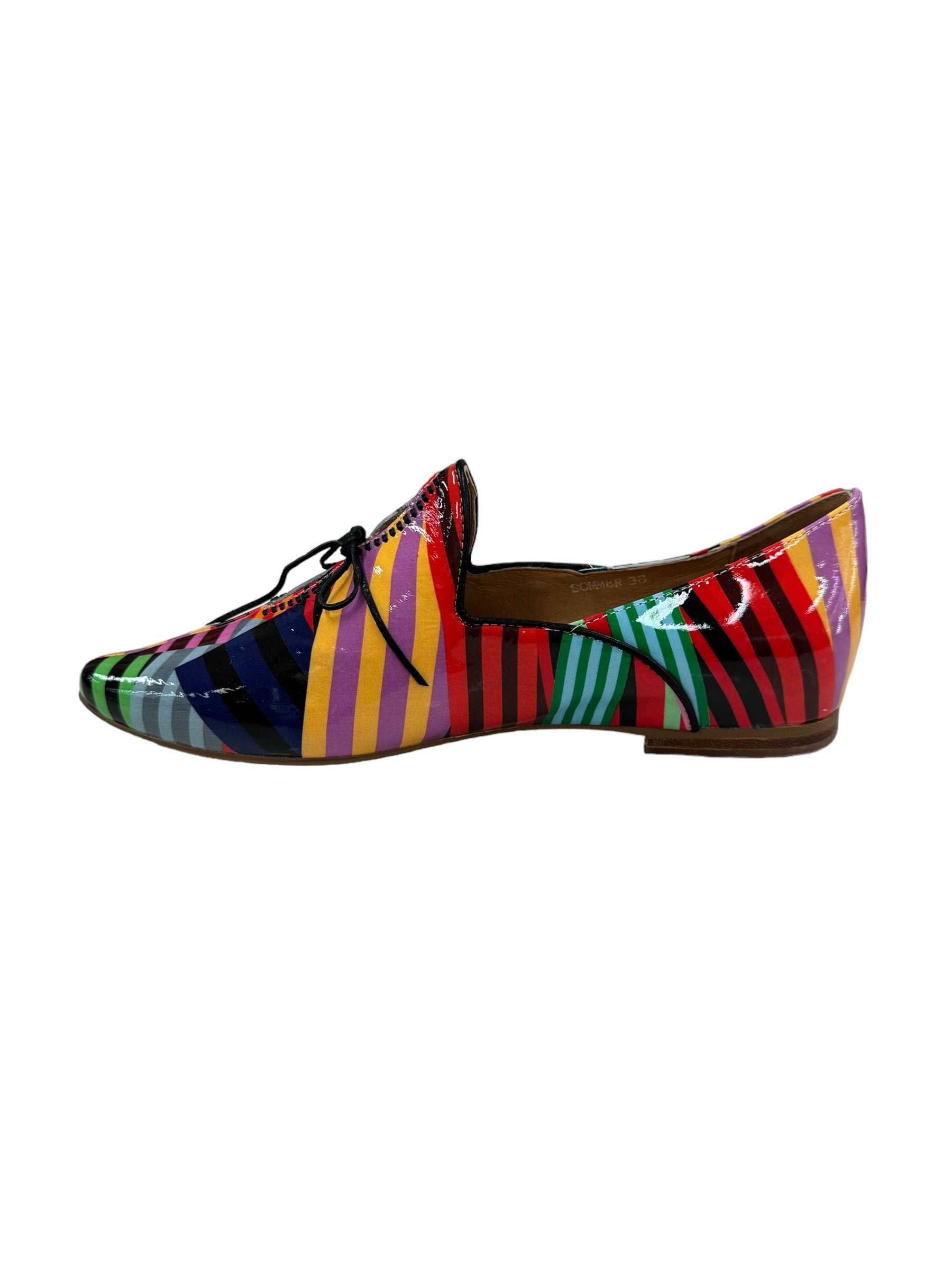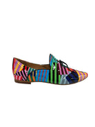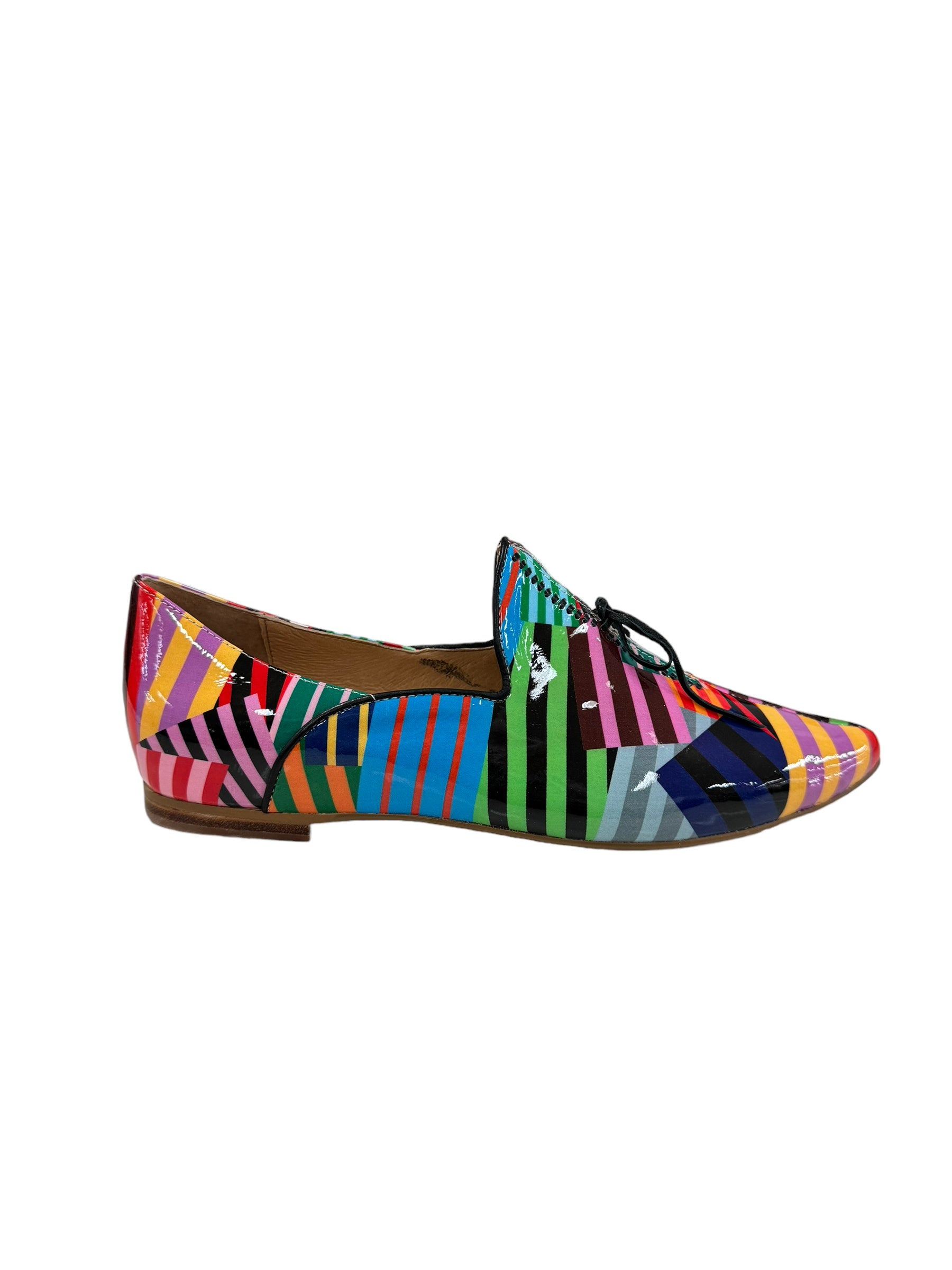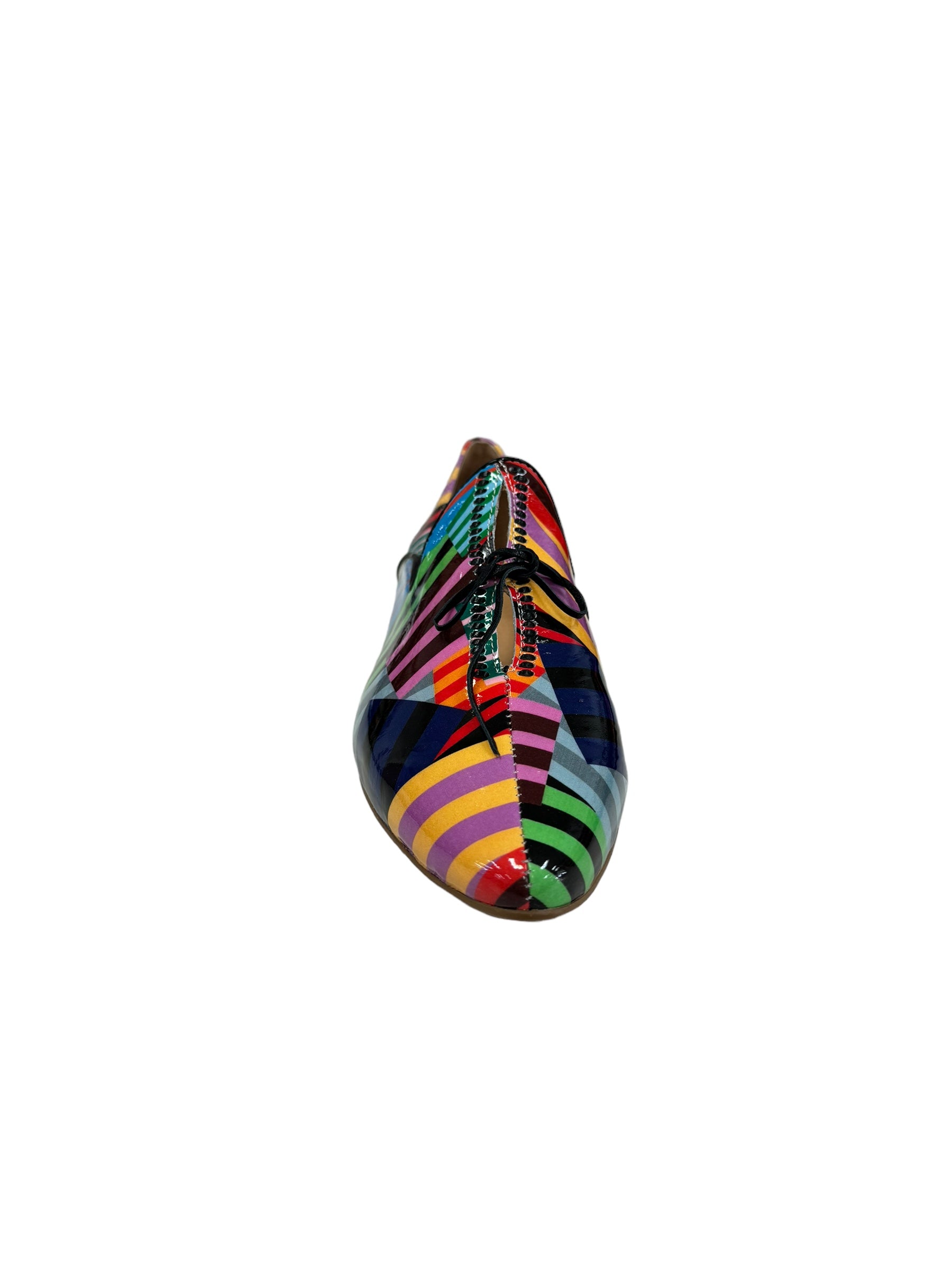 Shake things up with Sommer, the multi-colored crinkled patent pointed toe flat that is a true show stopper. Black leather lace, this leather shoe is sure to add a touch of whimsy to any look. Step out in style and comfort with this quirky and unique shoe.