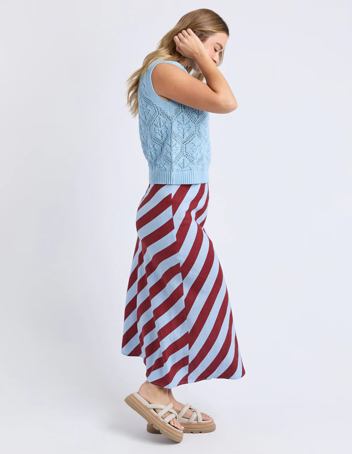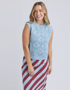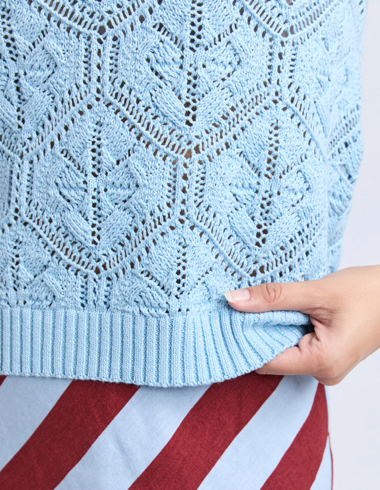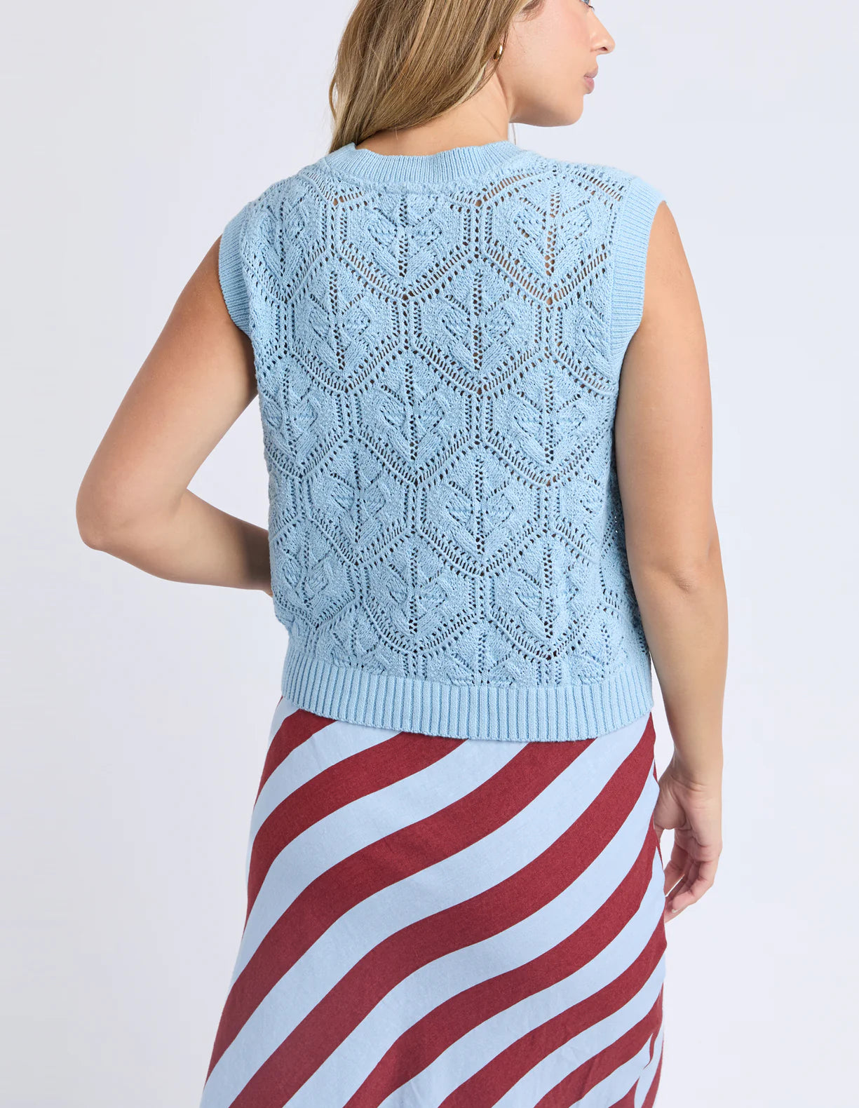 Crochet all the way! The ultimate in seasonal style the Luna Knit Vest is a cute pointelle sleeveless knit in cool vintage white that will look great atop any of your stylish bottoms.