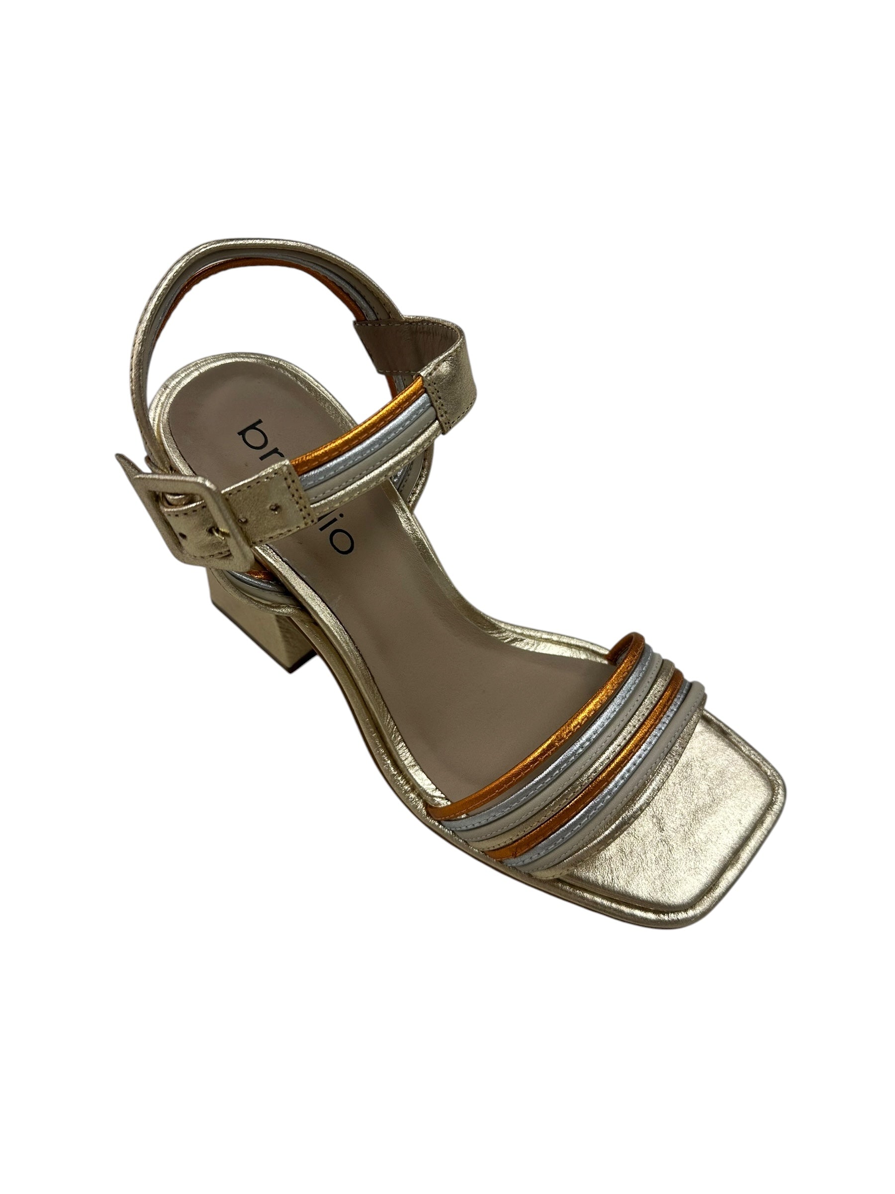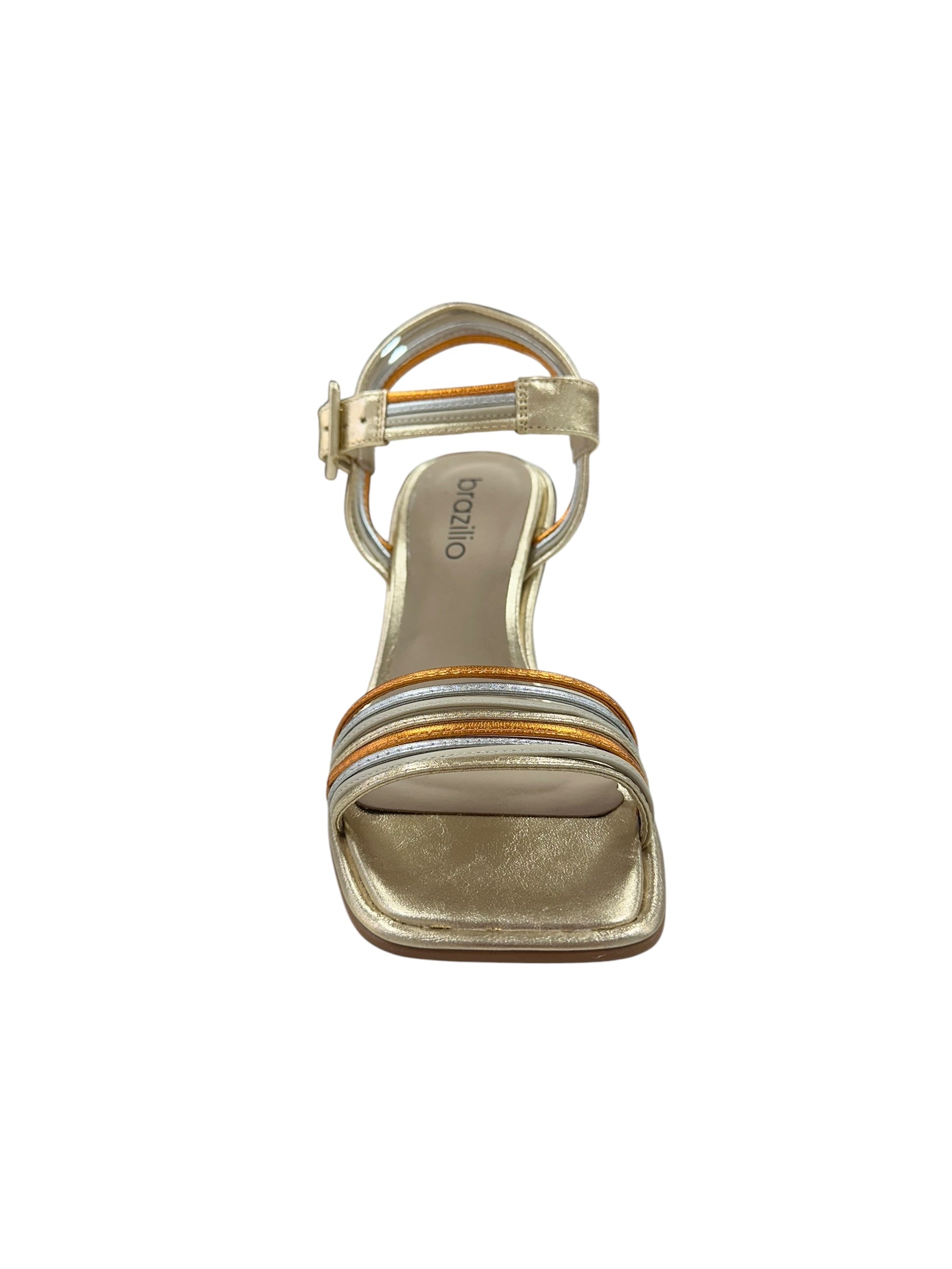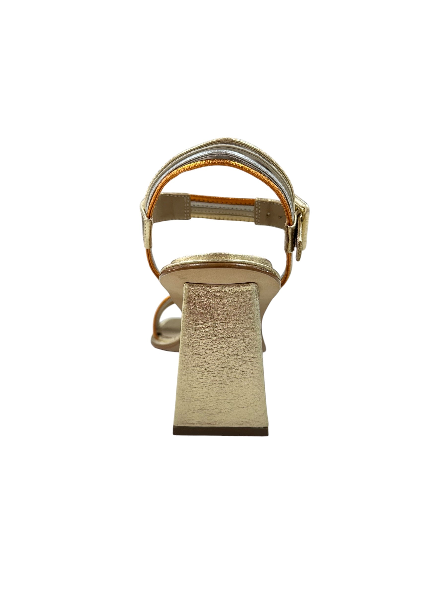 Step out in style with the Cristal, featuring a chic block heel in shimmering gold accented by striking silver and vibrant orange details. The adjustable ankle strap ensures a perfect fit, combining comfort with a playful pop of color for any occasion.