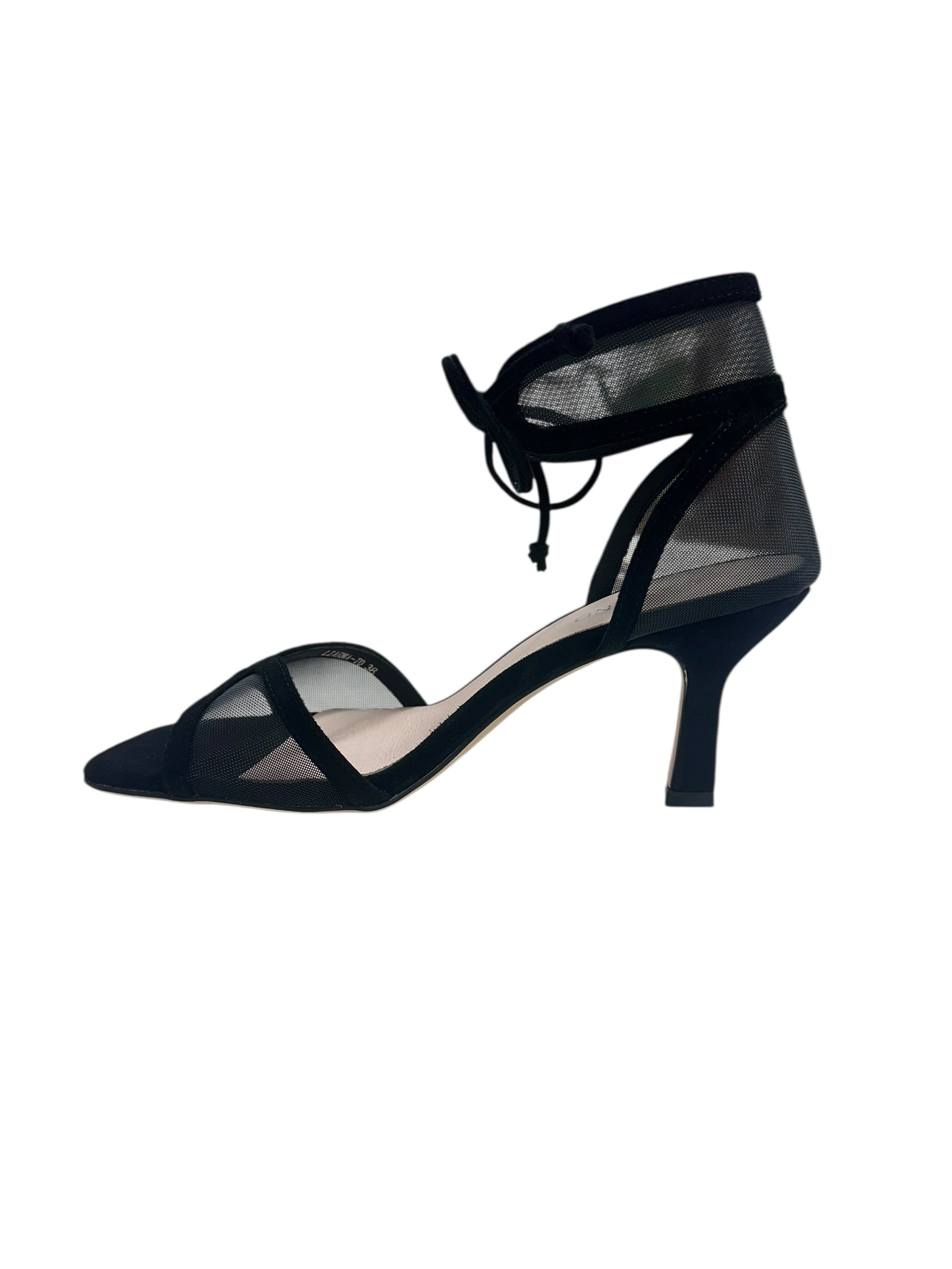 Step into sophistication with the Liarna—a chic black heel that's equal parts edgy and elegant. Crafted from luxe suede, this showstopper features delicate mesh detailing that adds an unexpected dash of intrigue. The adjustable tie-up ankle closure gives you the perfect fit while delivering that effortlessly cool vibe. Whether you're heading to a night out or elevating your everyday look, the Liarna is your new go-to for turning heads.