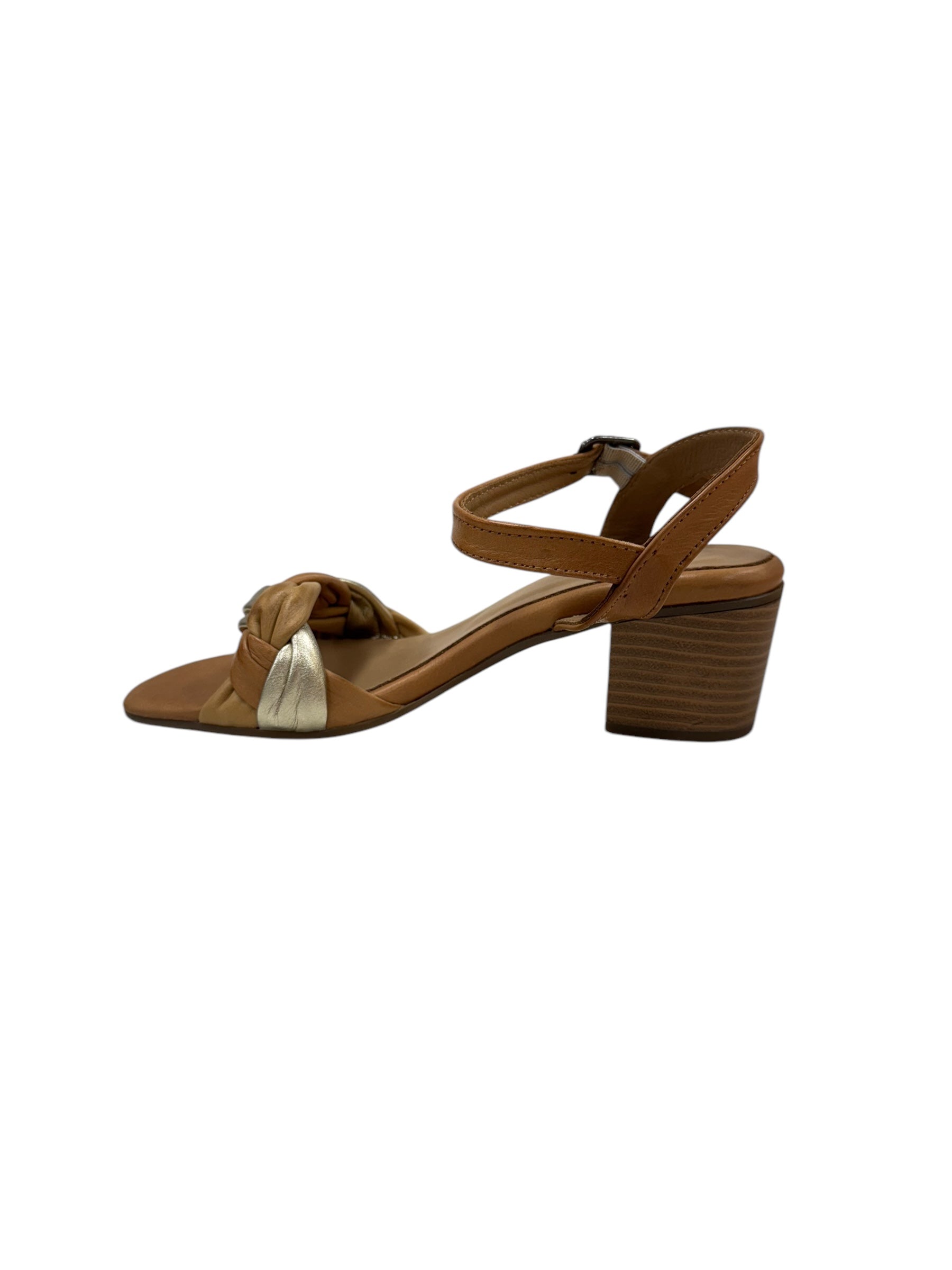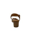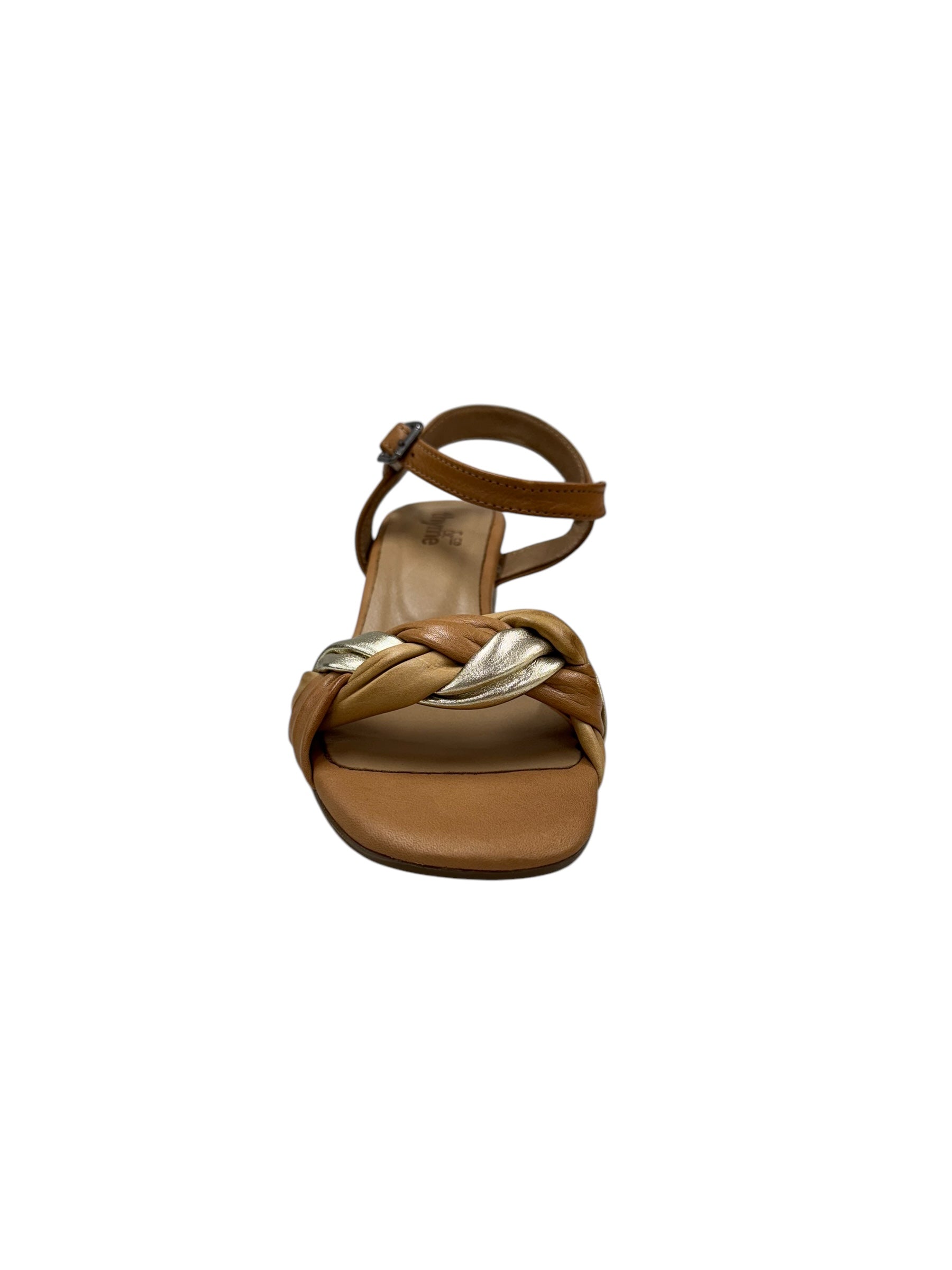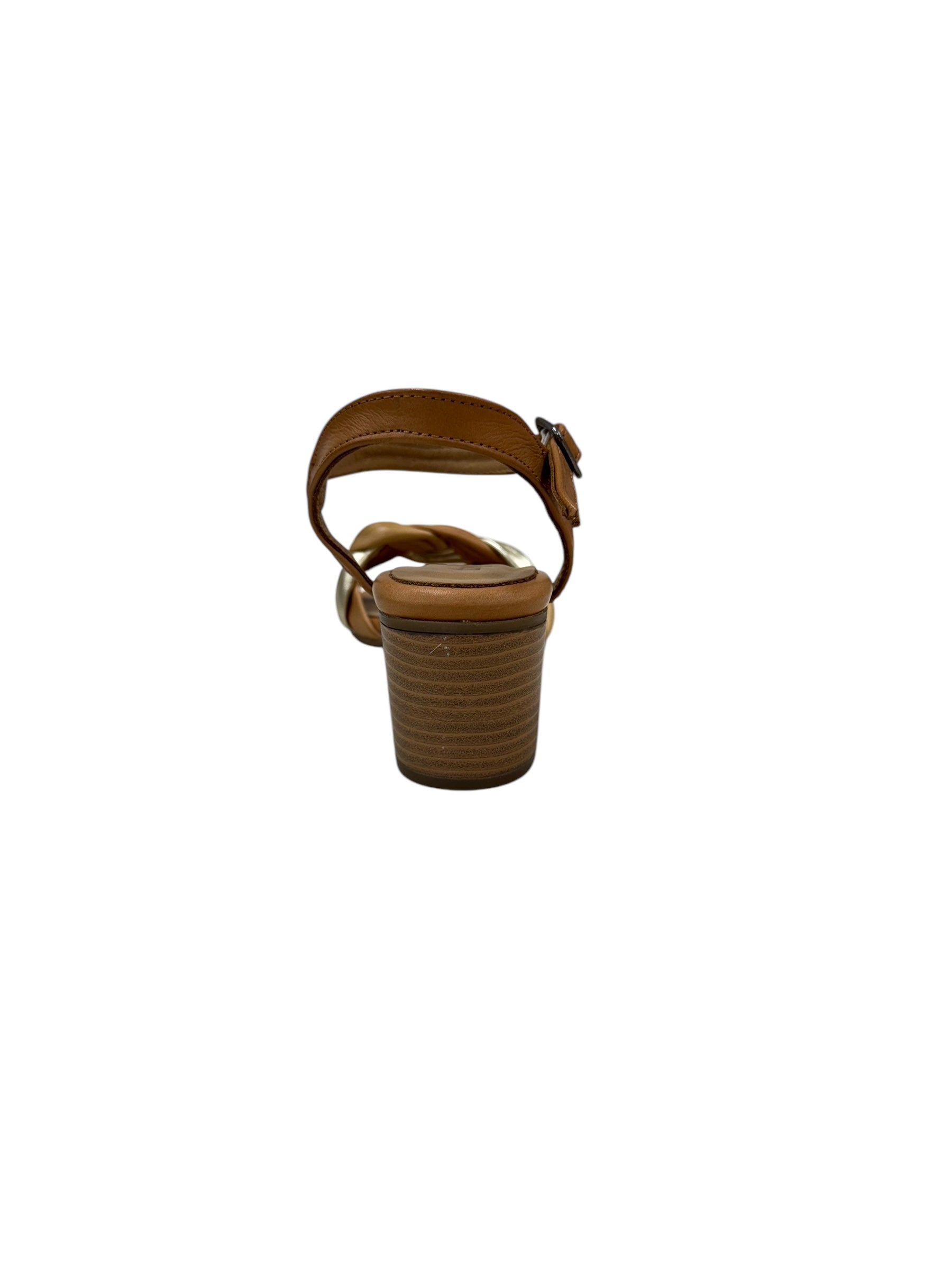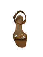 Introducing Tuvalu, a sophisticated and stylish women's sandal crafted from luxurious genuine leather. It features an adjustable buckled ankle strap, softly padded footbed, and strappy outer foot design of a mix of tan and metalic with a stacked heel, all working together to provide a beautiful, secure, and comfortable fit. Treat yourself to the high-end fashion footwear you deserve.