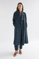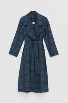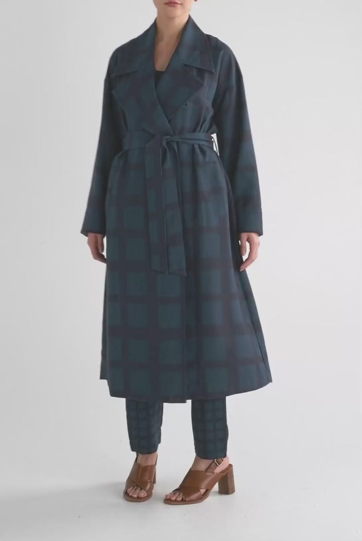 The Krata Trench Jacket is a double-breasted, unlined jacket with an exaggerated lapel and collar, and button closure down the front. The jacket also features a belt tie at the waist, welt pockets, and an inverted pleat vent detail at the back for comfort. The trench is crafted from a mid-weight fabric containing TENCEL™ Lyocell fibres, and sits at a midi length.