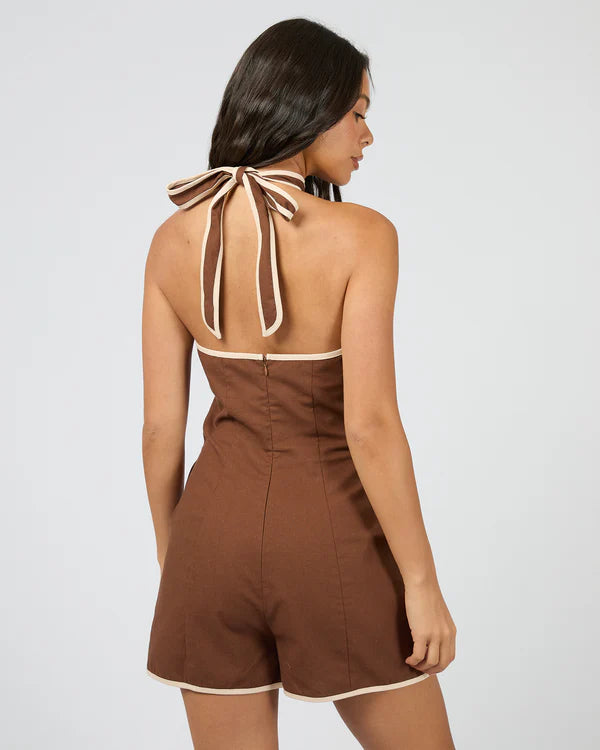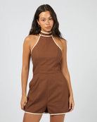 Introducing the Tyler Playsuit, made from a natural linen blend this playsuit will take you from beach to bar. The Tyler playsuit features a halterneck design with contrasting binding detail. Pair this with thongs or a cute heel for a verstaile look.