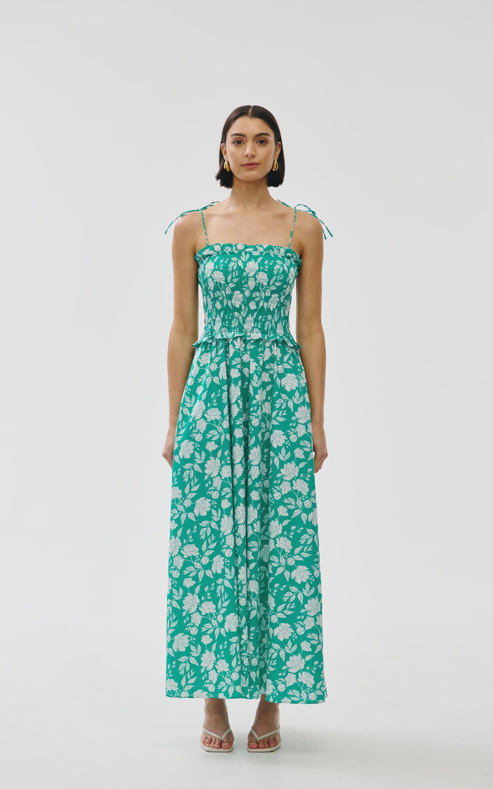 The Billy Dress in Taormina embodies effortless elegance with a botanical floral patternset against a vibrant emerald green base.