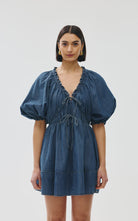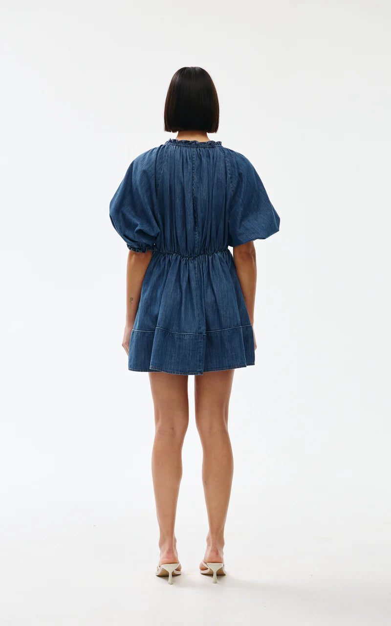 The Pia Mini dress is your perfect summer party dress. With voluminous sleeves and elevated details including gathering, piping, ruffles and ties. Re-cut in a mid-weight cotton denim fabrication.