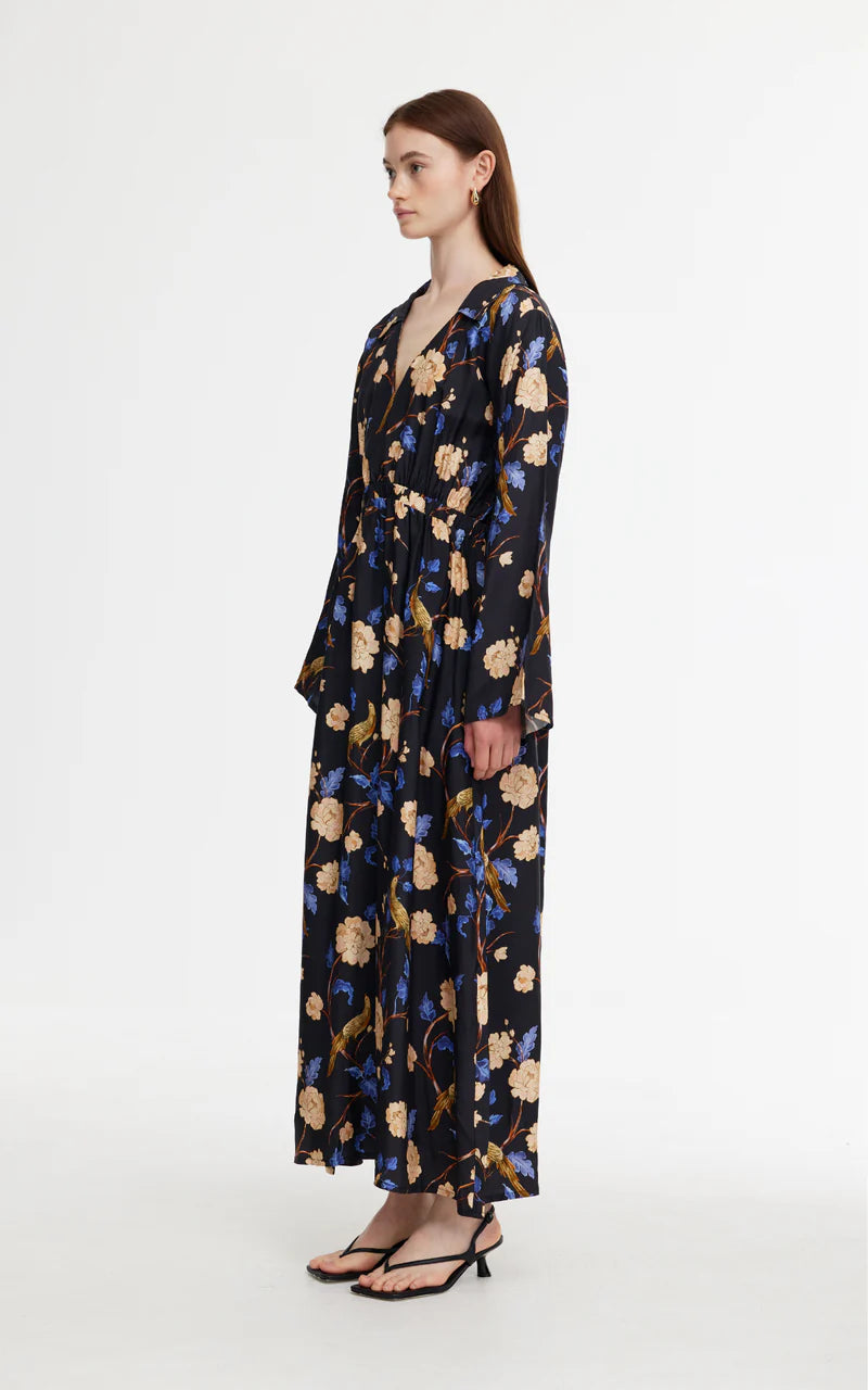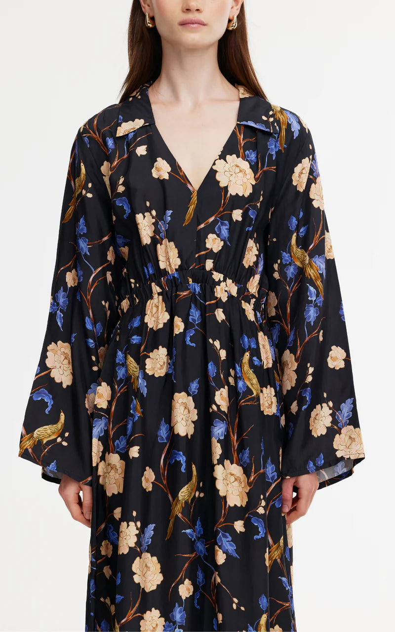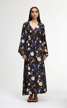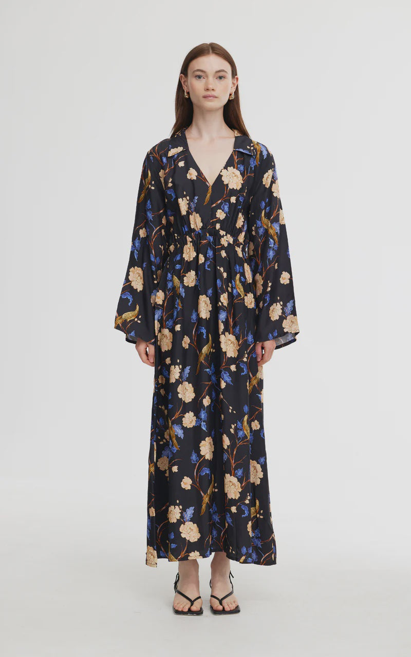 The Stevie dress is a 70’s inspired maxi dress with wide sleeves, a v-neckline and a one-piece collar. The waist elastic has been designed to give this piece shape and ease-of-wear.
