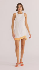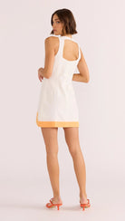 Update your beach to bar wardrobe, with the Alora Wave Mini Dress by MINKPINK. Featuring a lightweight fabrication, and a relaxed shape. The Alora Wave Mini Dress is white and features an orange hemline and an aysemmetric a-line fit Pair yours with a chunky slide for an effortless poolside look.