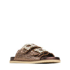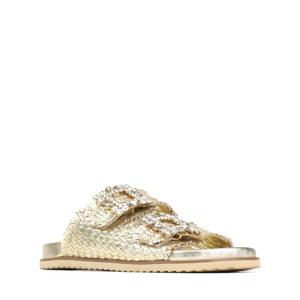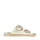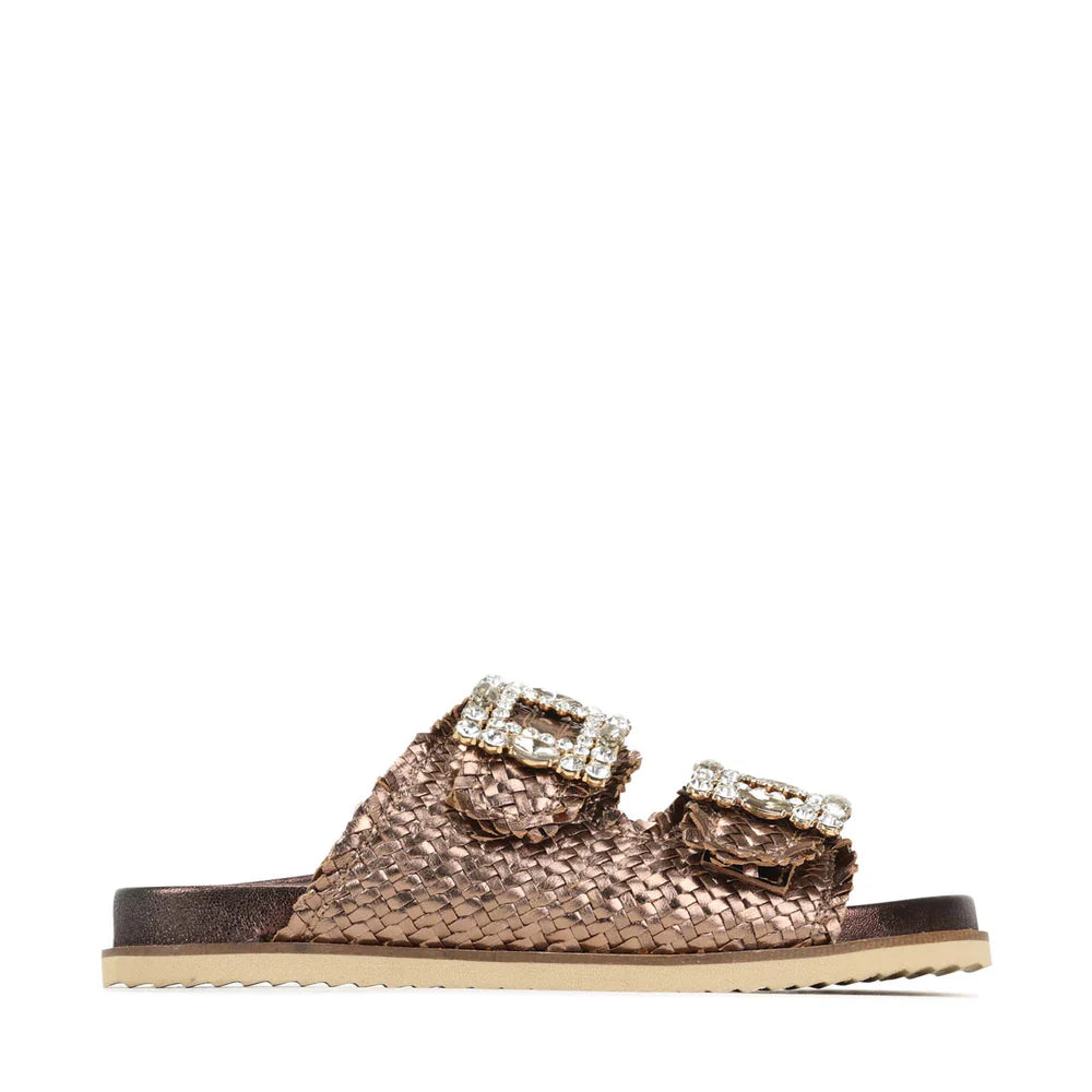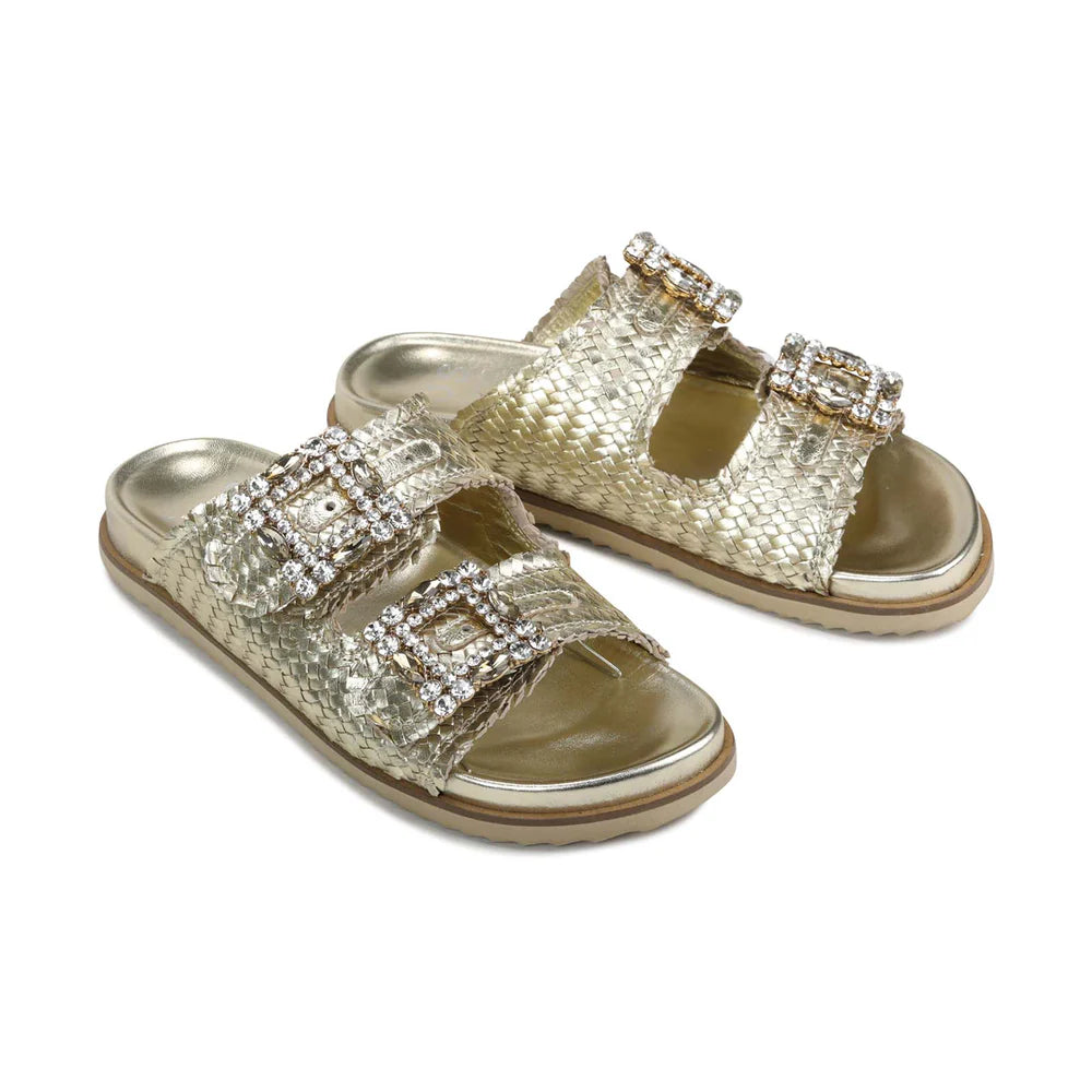 Our ADINAH Sandals are designed to combine style and comfort effortlessly. Crafted from metallic woven leather with rhinestone-embellished buckles, these slides offer a touch of glamour while staying practical. Dual adjustable straps and a leather-moulded footbed provide a secure fit and support your natural arch, making them perfect for all-day wear.