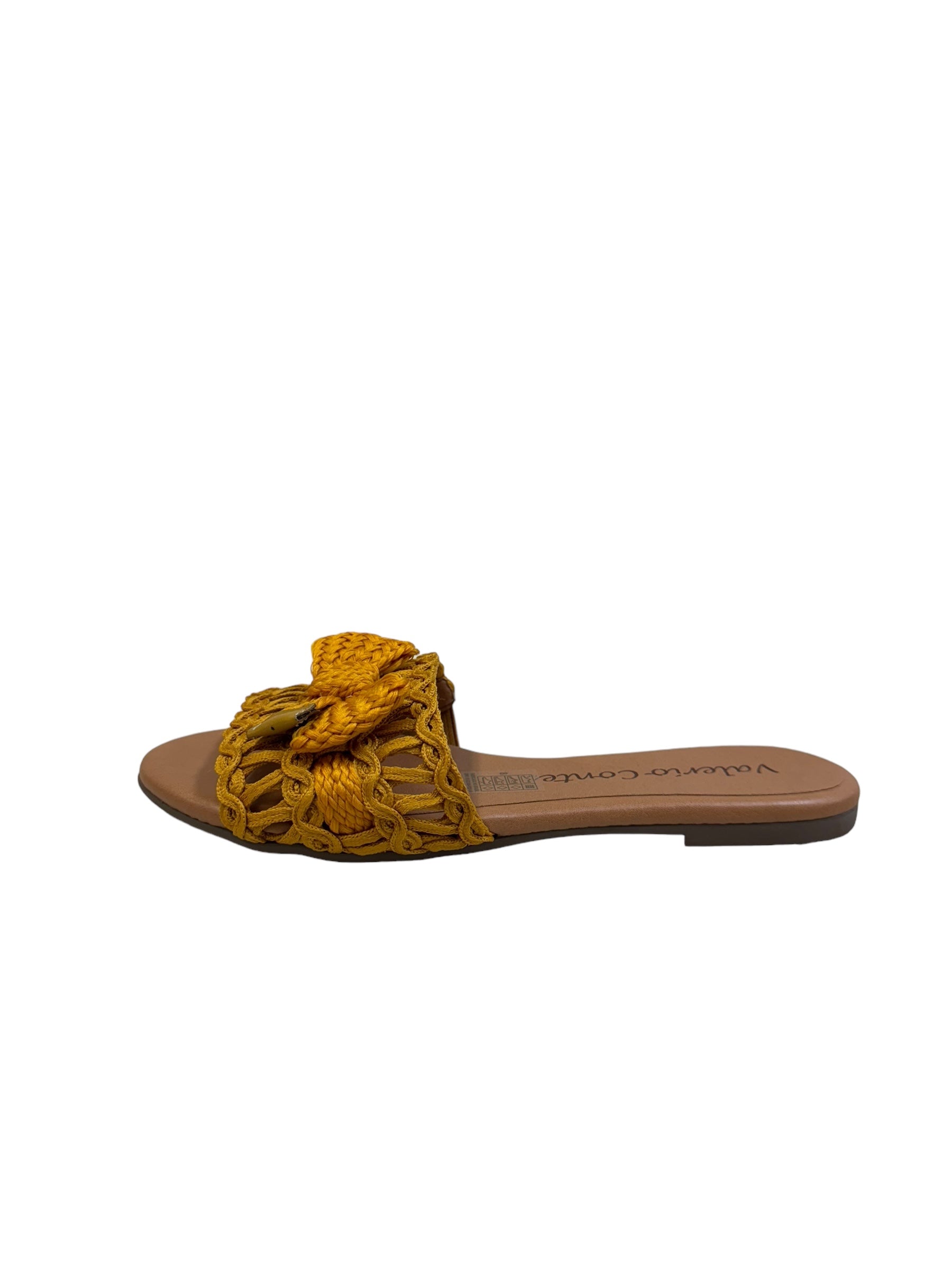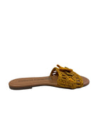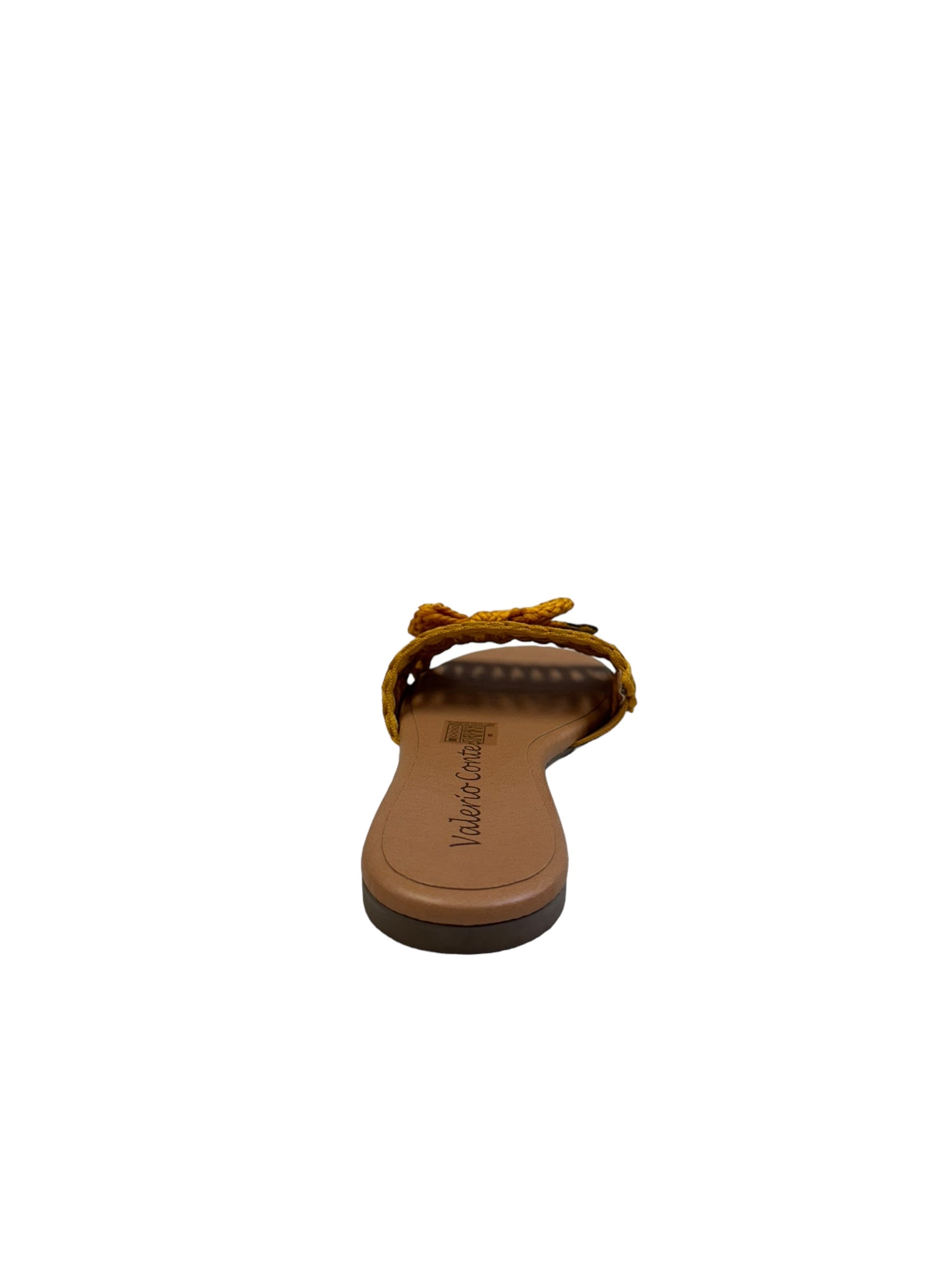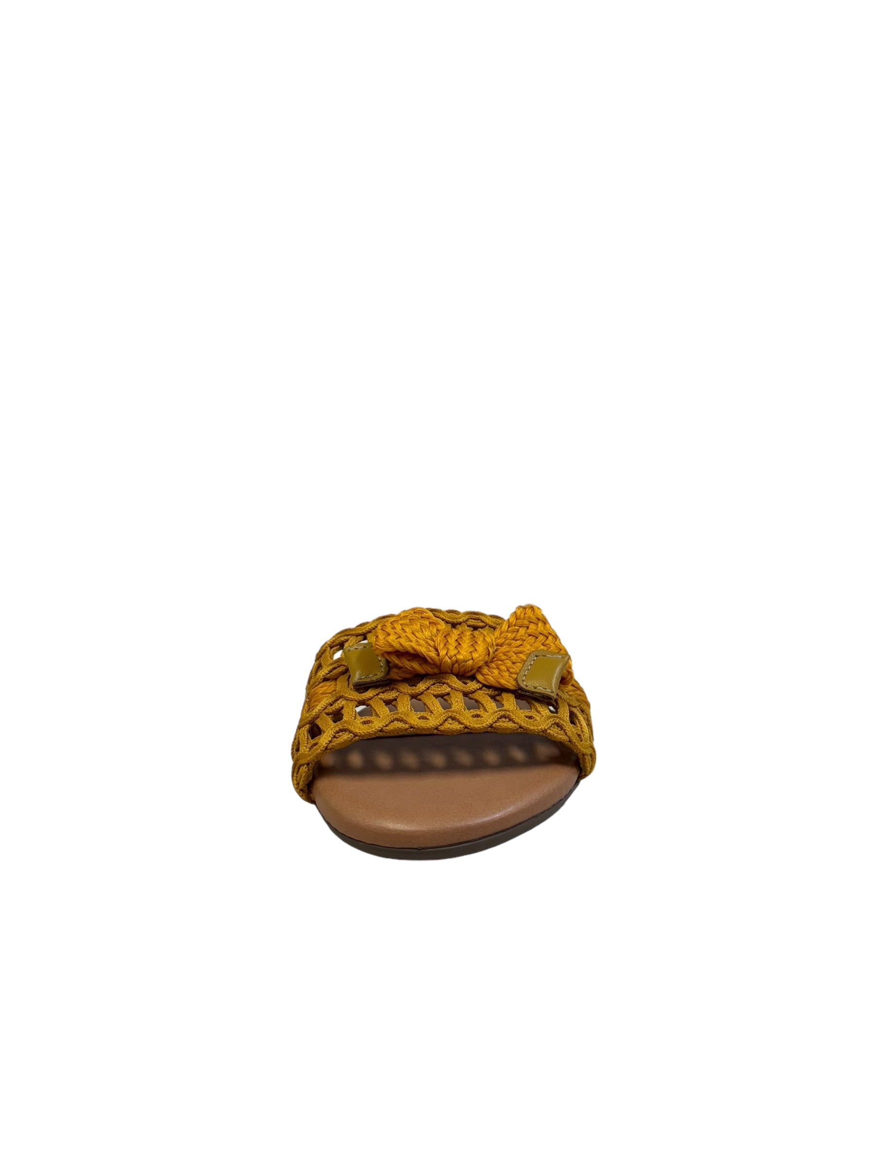 Introducing the Peachy Slide, your perfect summer shoe. With a mustard-colored fabric bow feature, these slides add a touch of playfulness to any outfit. Simple yet fun, the PEACHY SLIDE is a must-have for your summer wardrobe.