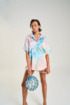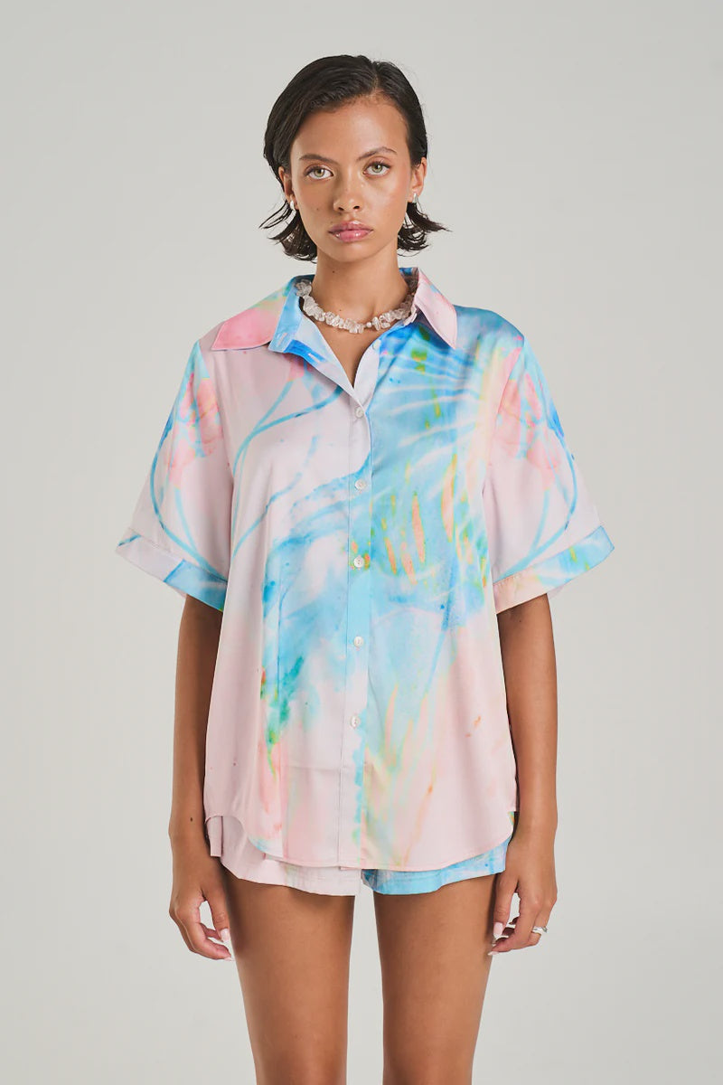The Button Up Shirt made from silky cupro features the Medusa Phase print in soft pastel hues, designed for a sleek yet relaxed fit.