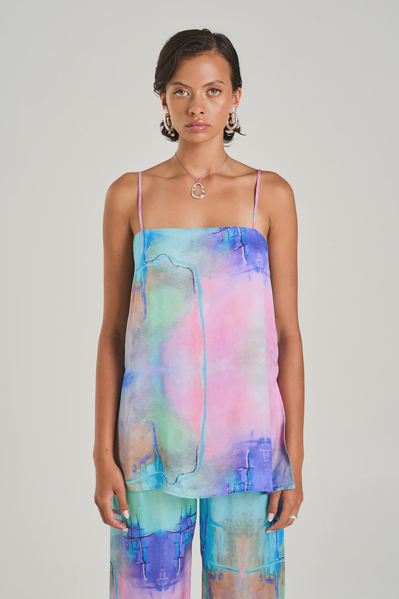The Tunic Top showcasing the hand-painted H20 print has been crafted from a silky viscose/ rayon blend and boasts a straight cut bodice, adjustable straps, and a flowing body with side slits for style and functionality.