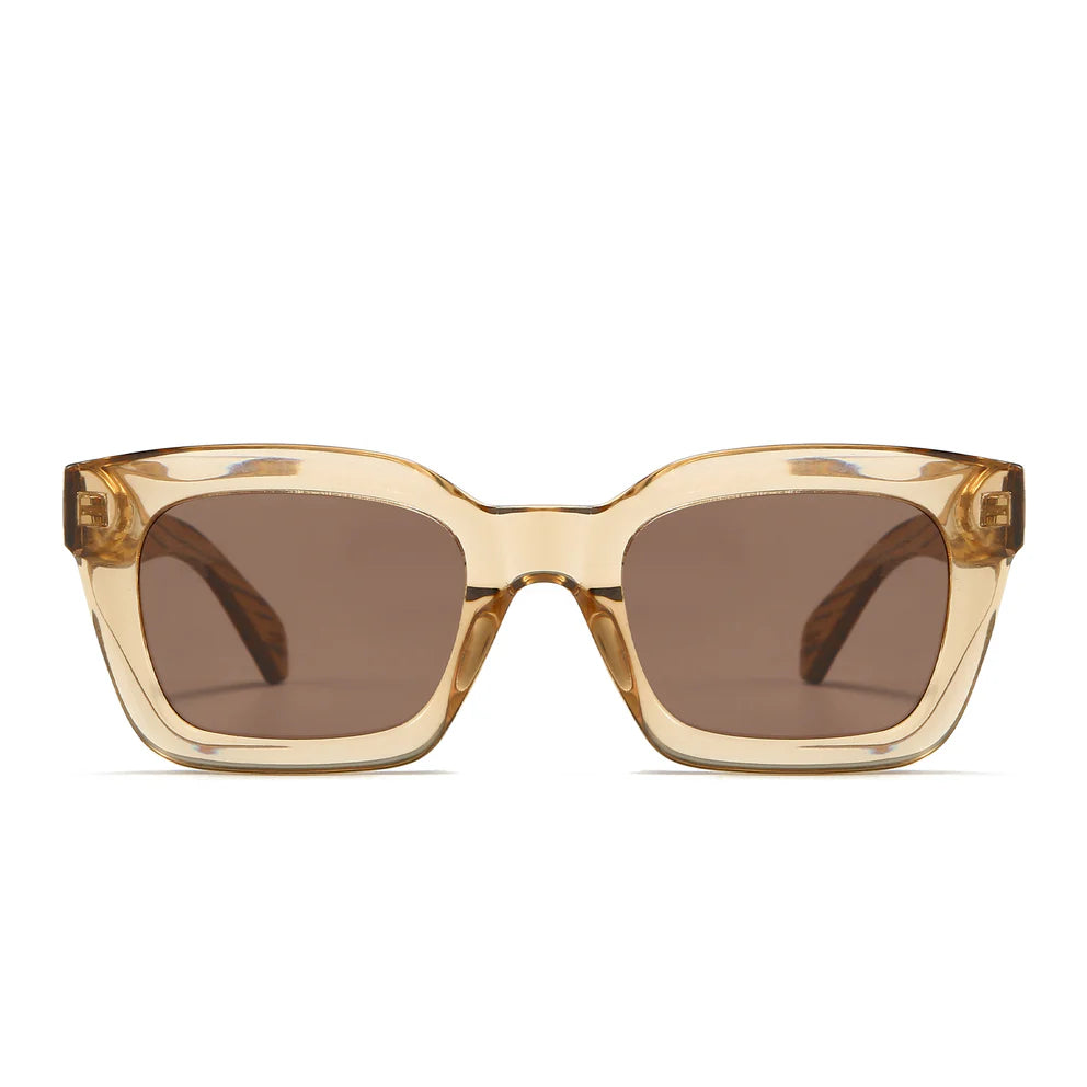 Our best-selling, 90s inspired Zahra sunglasses are a mid-sized style that will suit most face shapes and sizes. Zahra sunglasses are now available in a flattering champagne tone with polarised smoky tinted lenses.