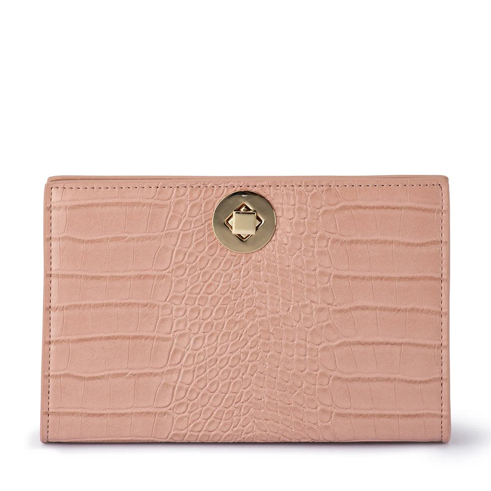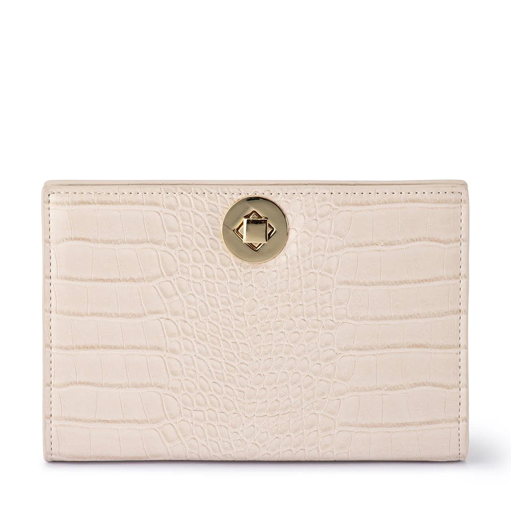 The LUNA A-Line Clutch features a striking croc-inspired emboss that adds interest to its sleek silhouette. Ideal for both day and night, this stylish clutch effortlessly elevates any ensemble with its roomy and sophisticated design. This versatile bag includes a removable shoulder chain that conveniently unclips when not in use.