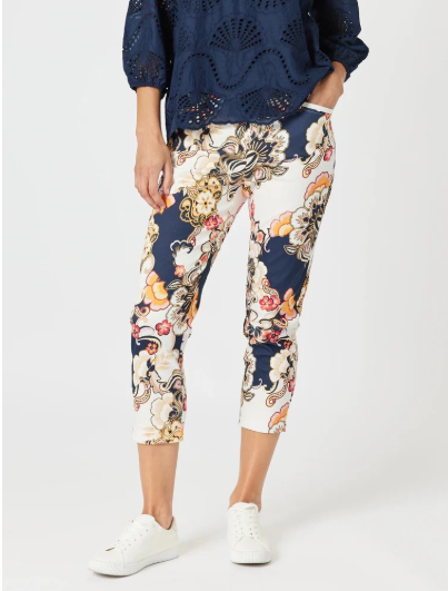 Introducing our ultimate comfort-meets-style staple: these stretchy patterned pants are designed to fit like a glove and move with you throughout the day. Made with a soft, flexible fabric, they feature a flattering elastic waistband that stays perfectly in place without digging in. The navy base is elevated with a beautiful, eye-catching pattern, making them a standout addition to any wardrobe.