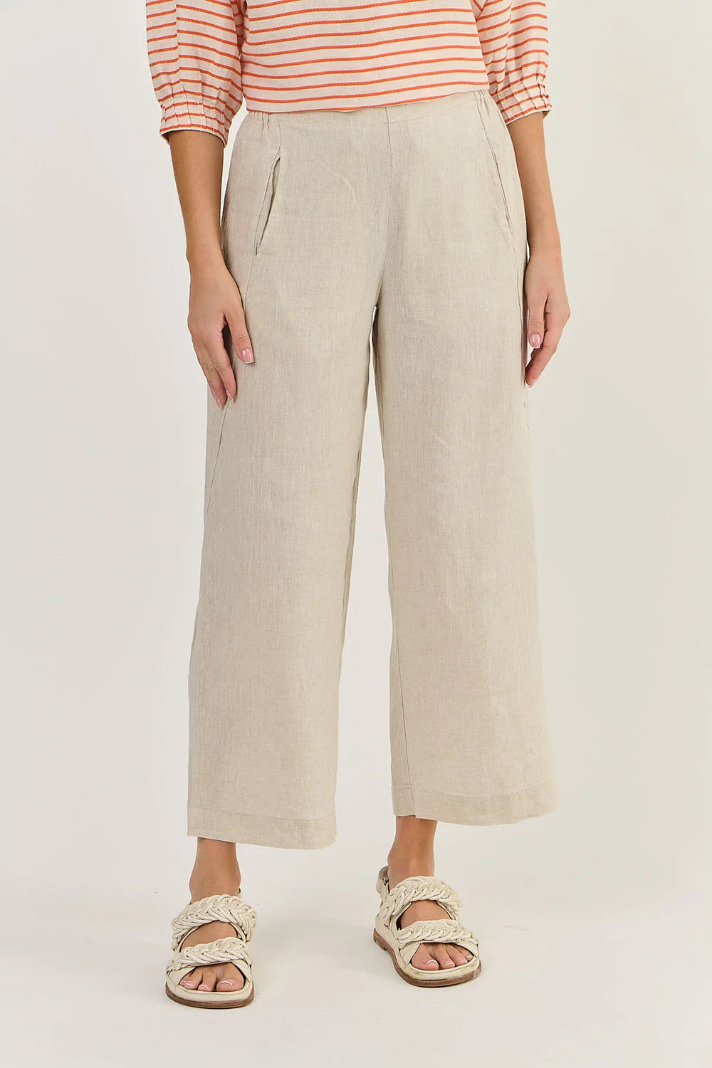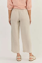 Step into effortless style with the Naturals by O & J Linen Pants in Sand. Crafted from 100% breathable linen, these full-length, wide-leg pants offer a relaxed yet tailored look. The unique Ikat print adds a touch of artistry, making these pants a versatile piece for any wardrobe. Designed with two front pockets and an elasticated back waistband, they provide both style and comfort for everyday wear.