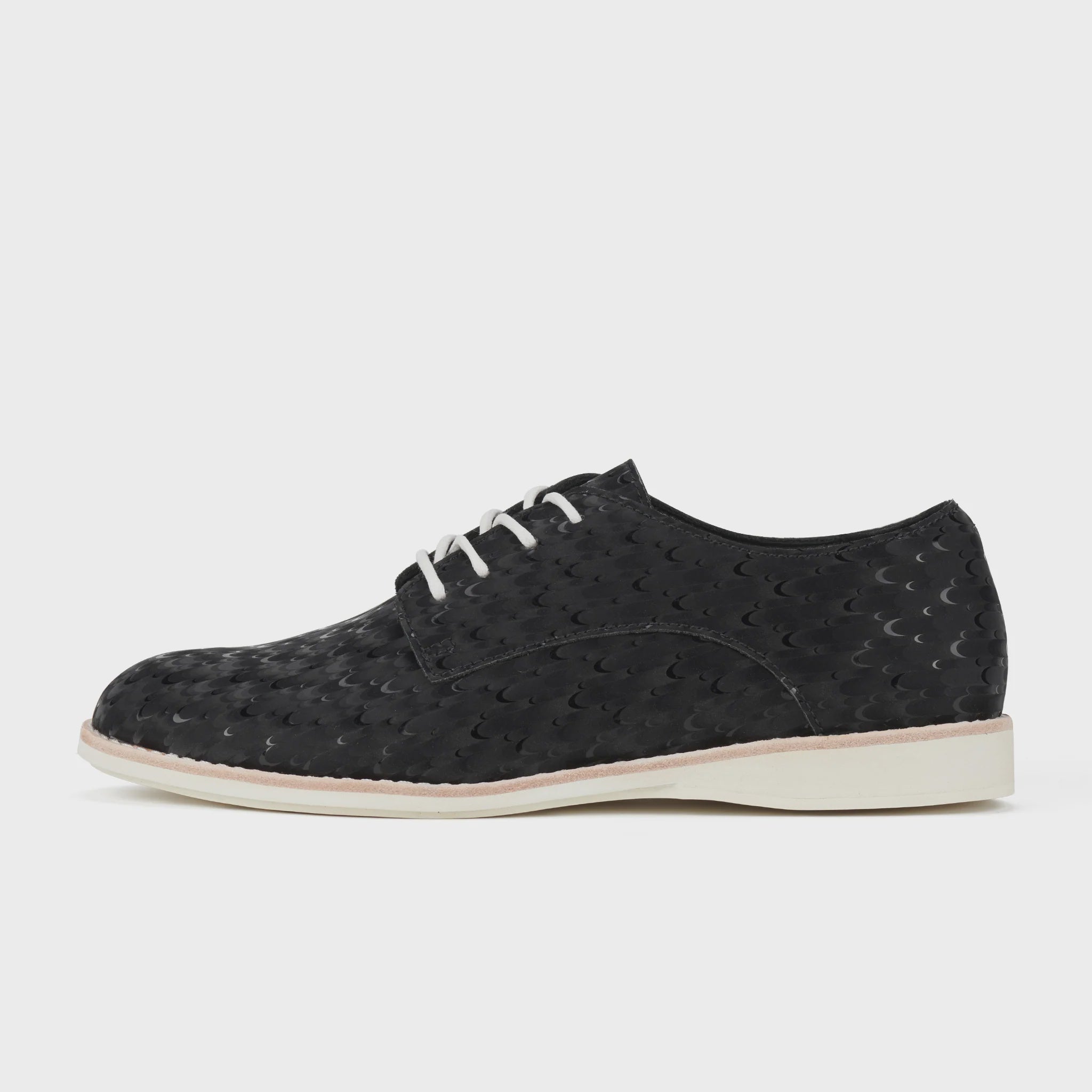 Introducing the Derby Black Peacock shoe. Crafted with a textured leather exterior, this shoe offers a timeless and sophisticated look. The lace-up design ensures a secure and comfortable fit, perfect for any occasion. With its flat construction, this shoe provides both style and function for your everyday wear.