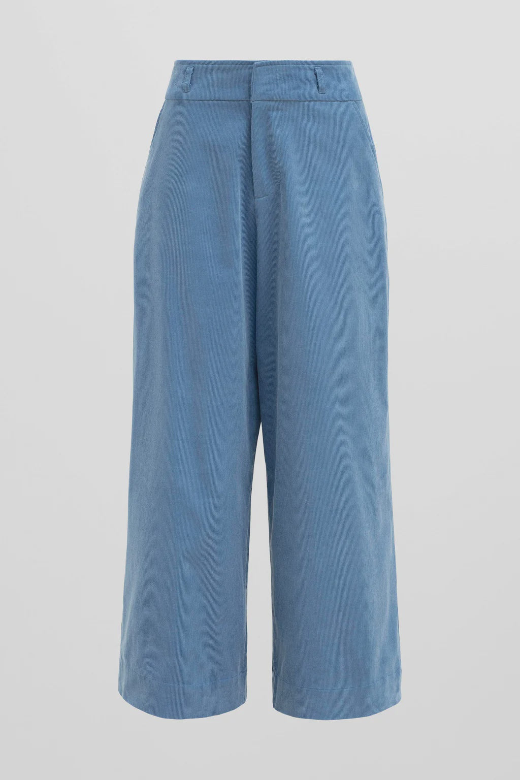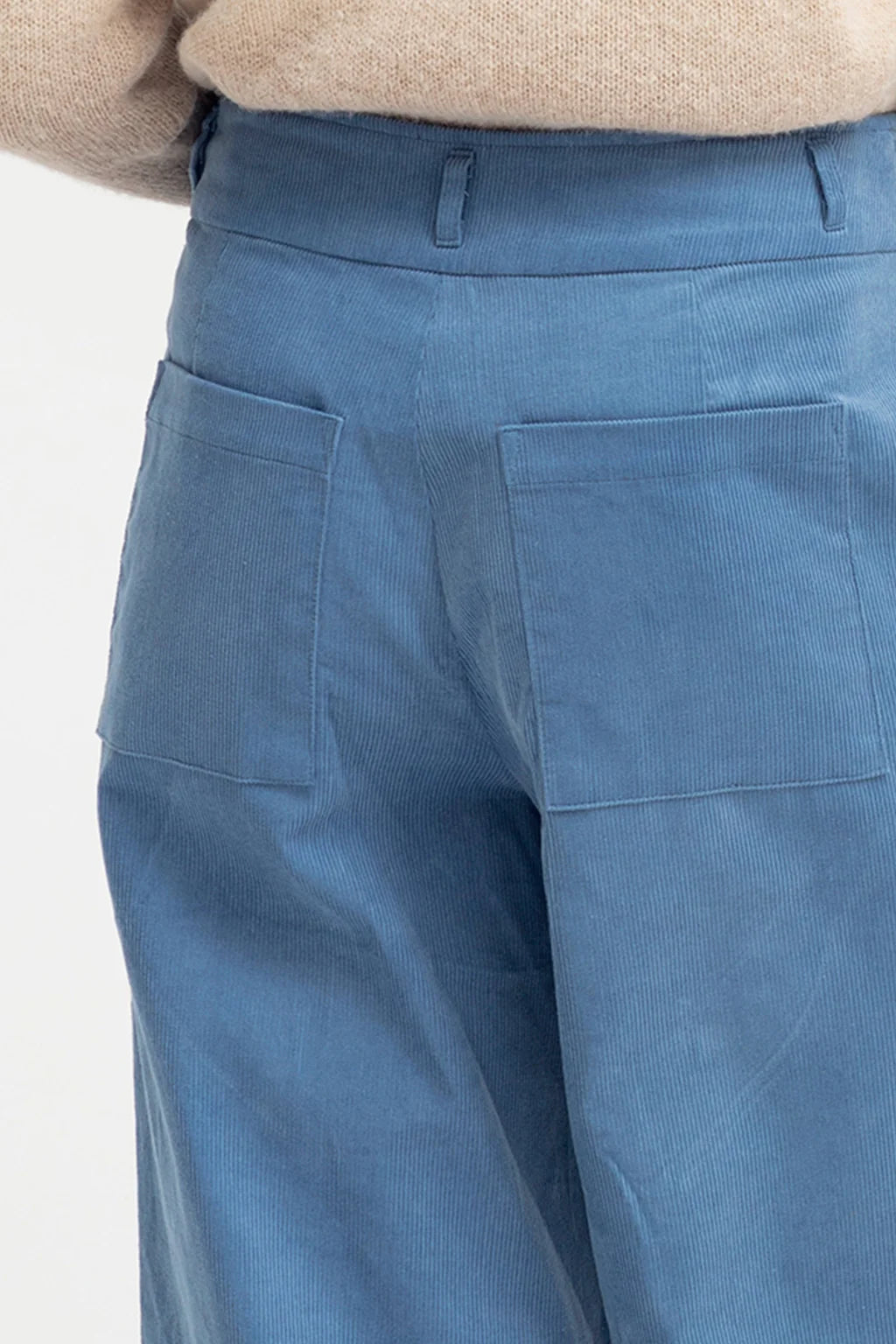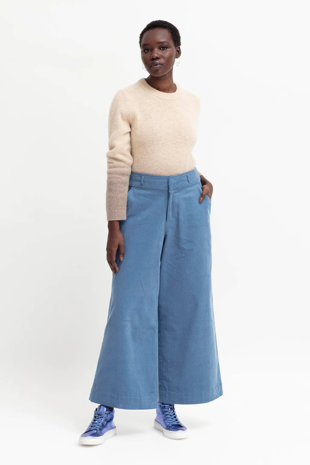 Crafted from an organic cotton fine cord, the Koord Pant is a wide leg pant with a hem turn up, hitting at or just below the ankle bone. Secured at the waist with a flat waistband with belt loops, and a front zip fly plus a hook and bar closure, this pant features angled front side pockets and back patch pockets. There are darts at the back of the pant for an improved fit.