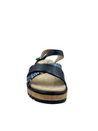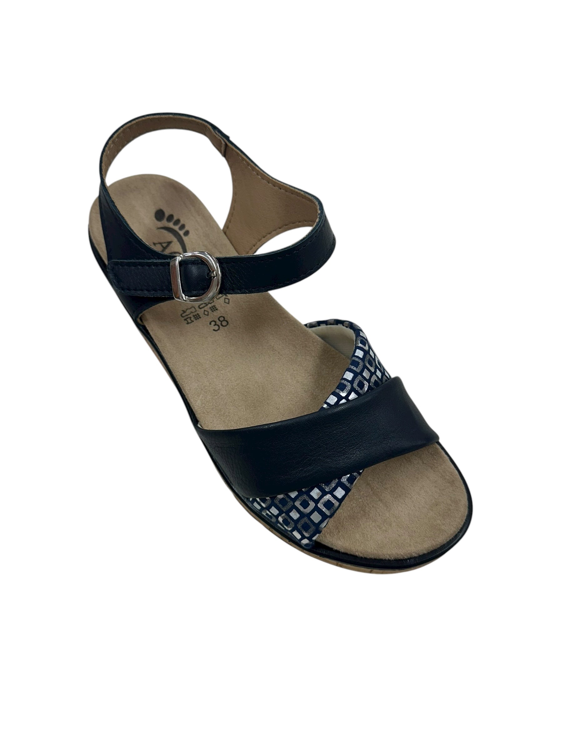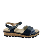 Meet Mia – the shoe that's as fun as it is functional! Featuring a removable velcro sole that's ready for your favourite orthotics, this playful navy number combines comfort with style. The soft, cushioned sole keeps your feet happy all day long, while the convenient velcro strap ensures a secure fit every time. Metallic accents add just the right touch of sparkle to this everyday essential. Slip them on and feel the difference comfort can make!