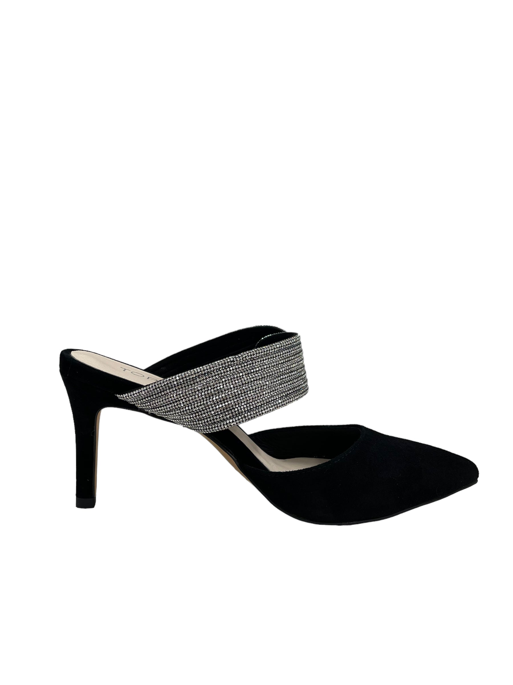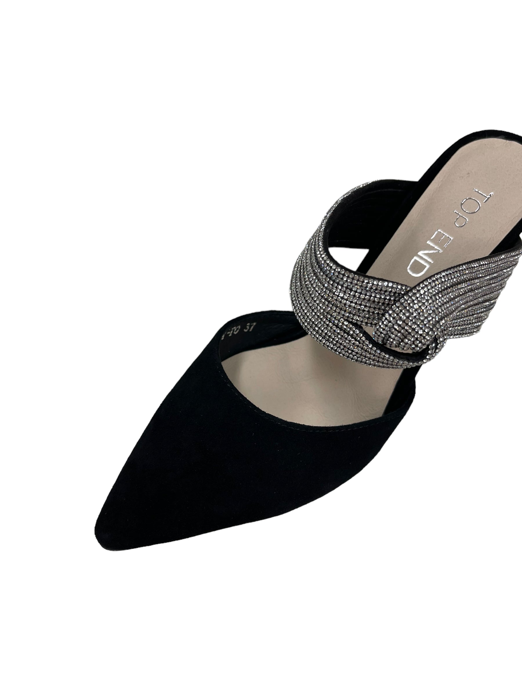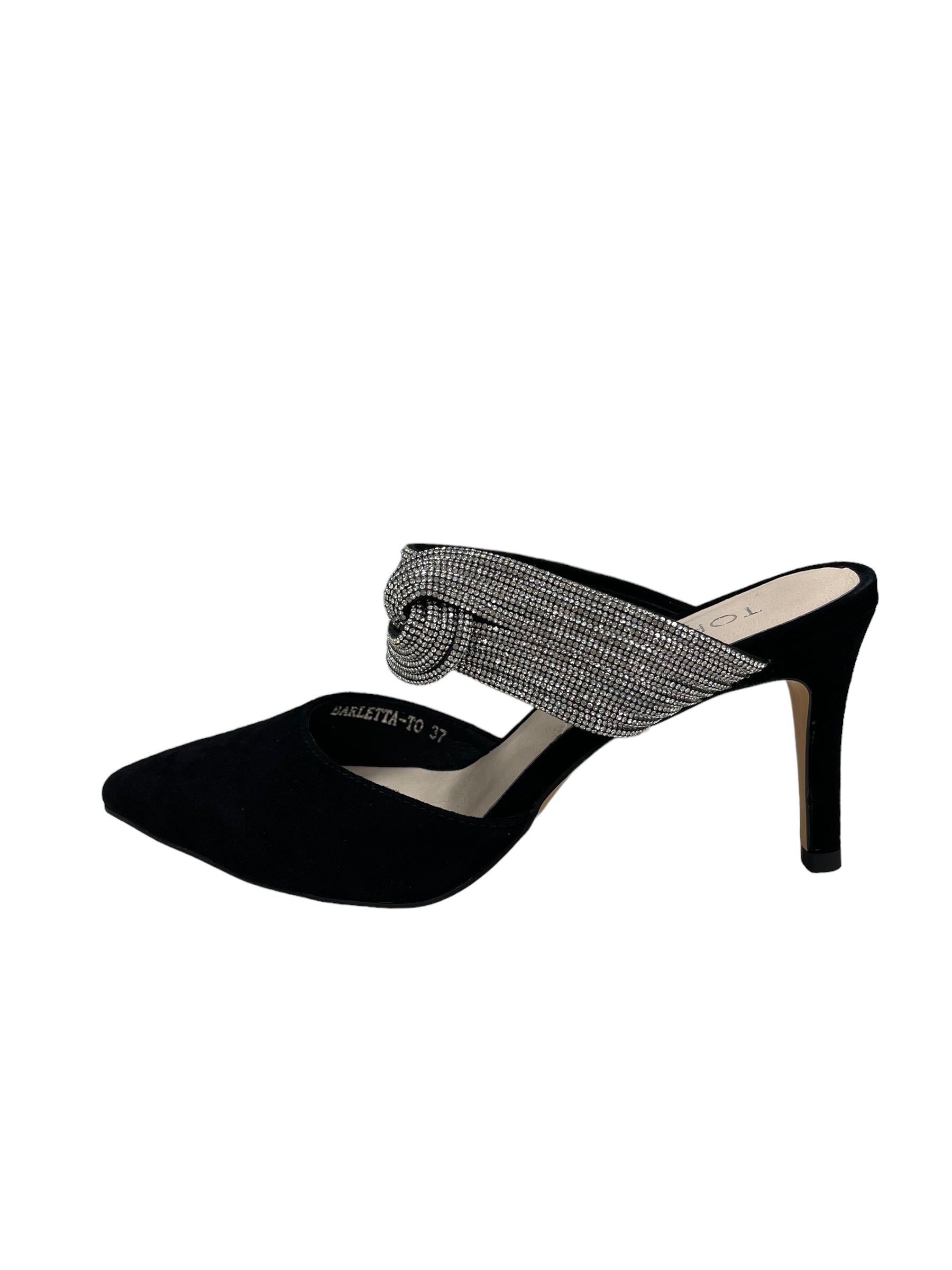 The Barletta Black heeled mules by Top End are the 'It' shoe of this season. This stylish heel features a pointed toe, a rhinestone-encrusted strap and a stiletto heel. These dressy heels are perfect to pull out for your next event paired with everything from a tailored pantsuit to silk slip dresses and jeans and a nice top.